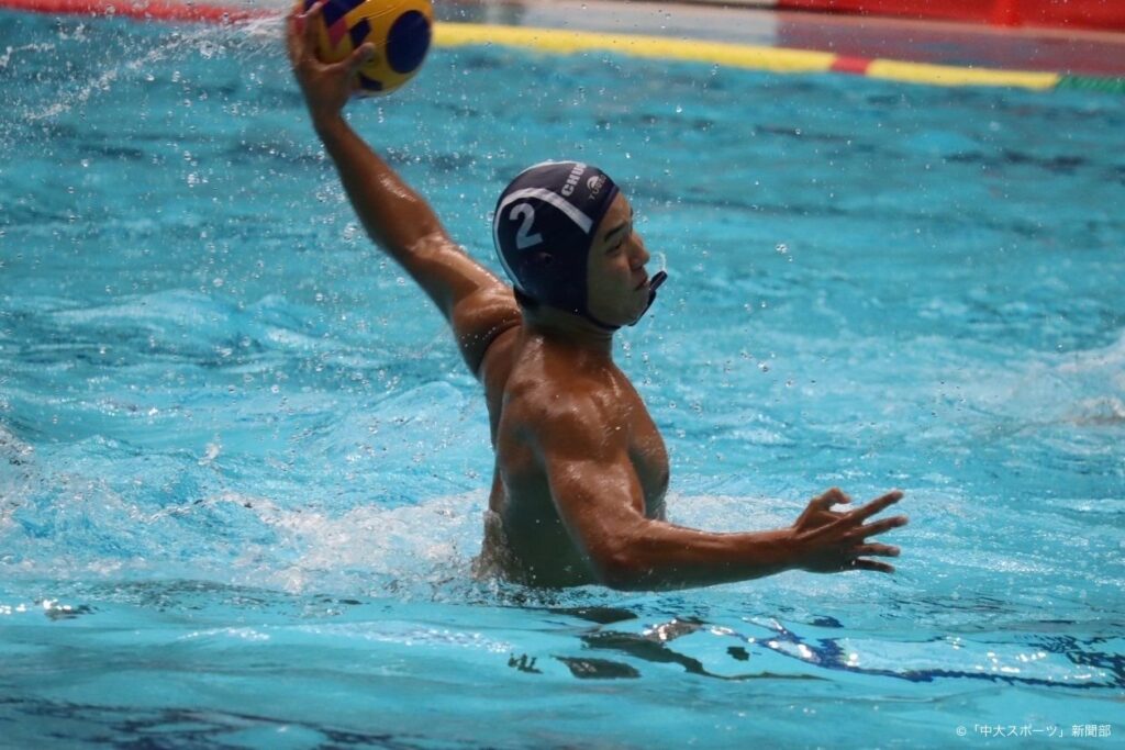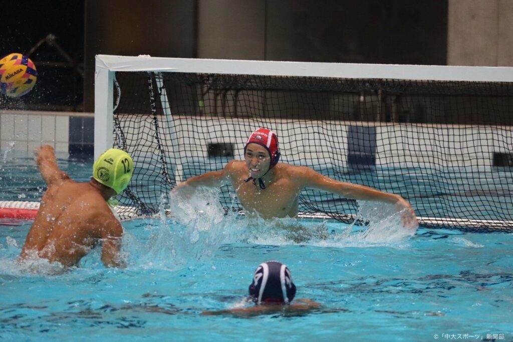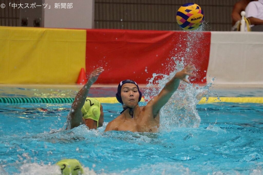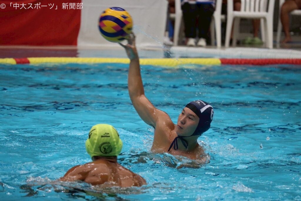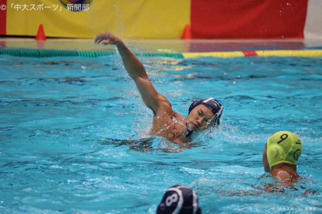 10点を追うかたちで始まった第3ピリオド。日体大ボールで試合が始まり、ゴール際まで詰められてしまったものの佐賀慶(文2)のディフェンスが機能しパスカットに成功。攻撃の体制に戻り、鈴木海斗(文2)からのパスを受けた佐賀がシュートを放ったがここでは得点とならなかった。中大に新たな得点が入ったのは残り2分半、森田がタイミングよく日体大のパスをカットしキーパー・安田へ。プールを縦断するパスを受けた森川翔(文1)がそのまま力強いシュートを放ち得点する。