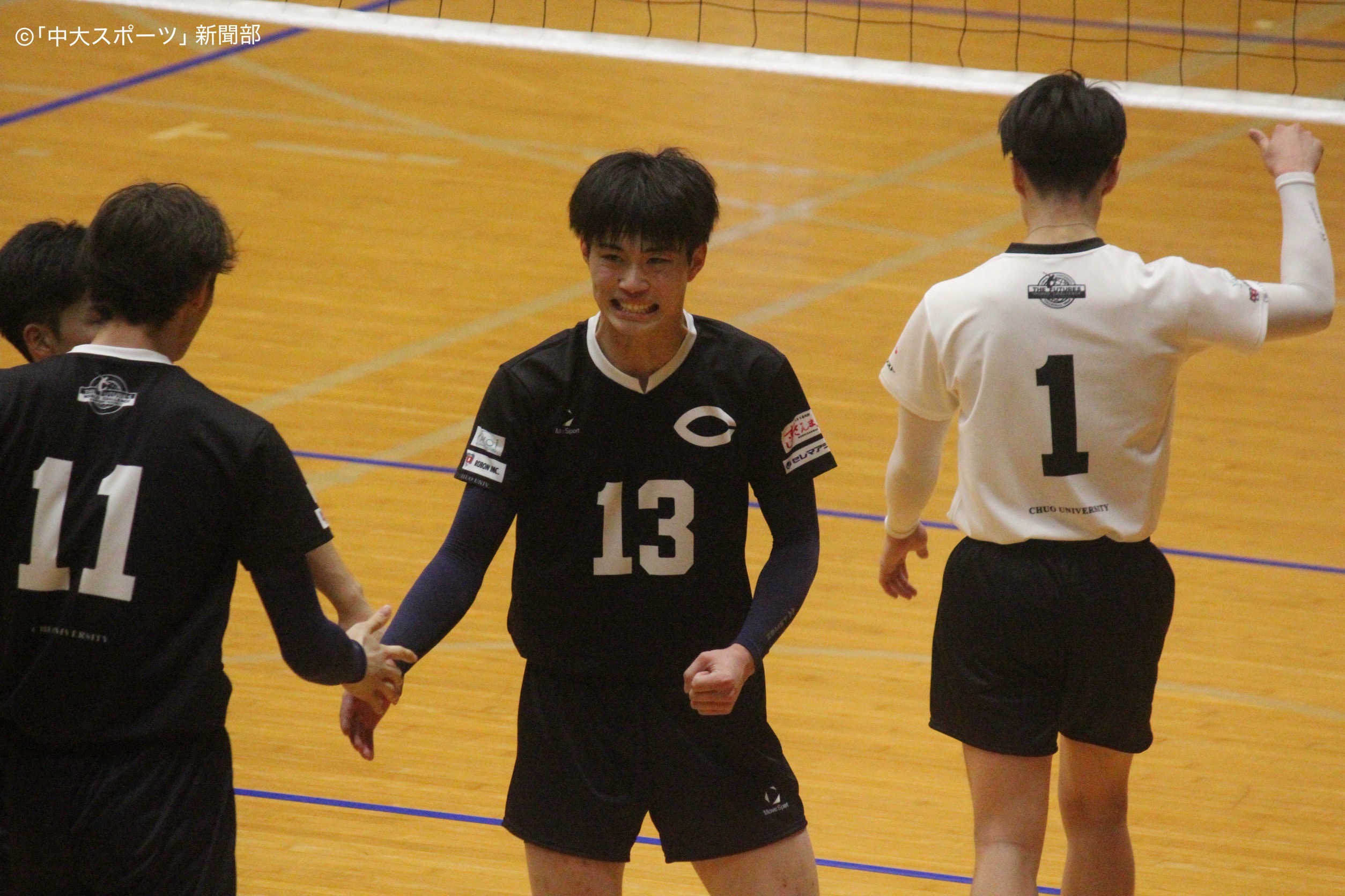第1セット開始直後、いきなり尾藤の強烈なスパイクが連続で相手コートを突き刺す。相手もすかさずスパイクやフェイントで得点を重ね、中盤まで均衡した展開が続く。主将の土井は試合の入りについて「100%あるうちの2割くらい。しっかり入りから100%と戦えるっていうのが課題になってくる」と振り返った。終盤は笹本、秋本のブロックが点差を広げ、25-22で第1セットをものにした。