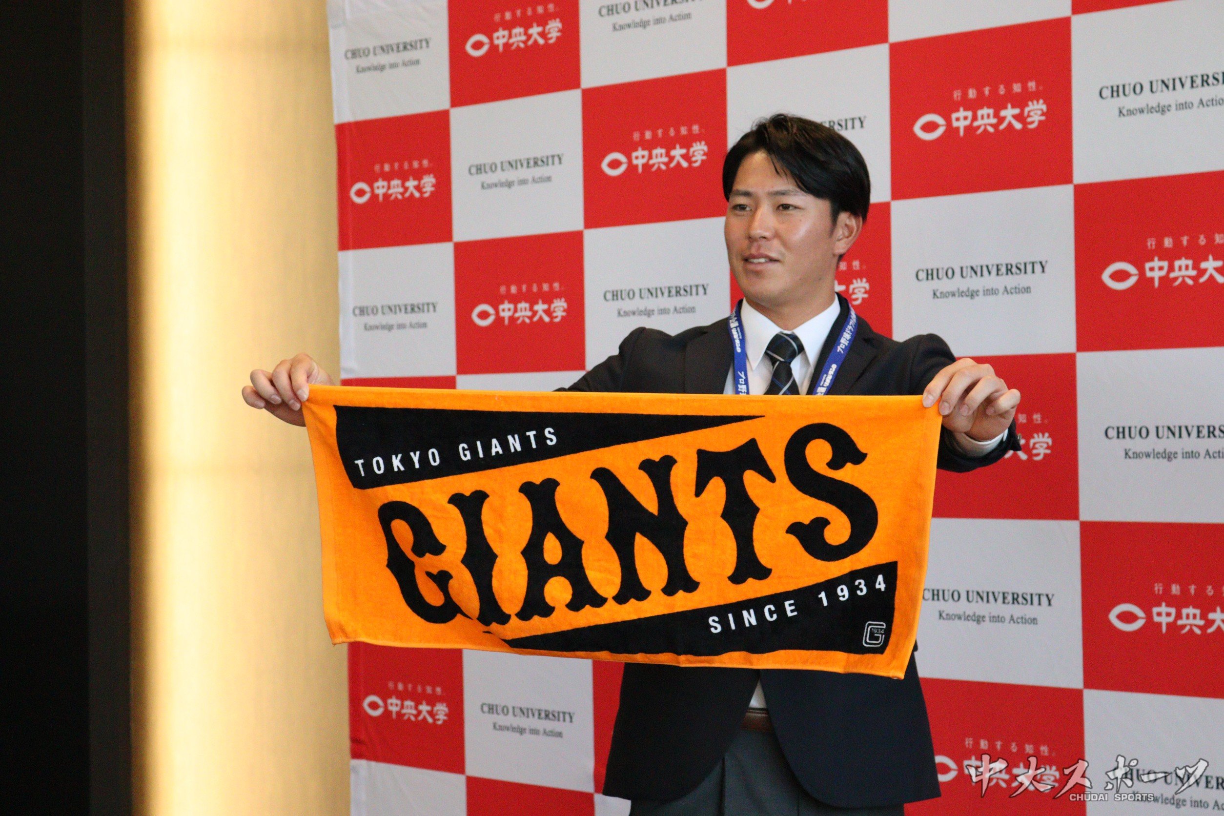 「大学に入ってからずっと、監督には亀井選手にタイプ的にも似ているってずっと言われていたので、縁のある読売さんに指名していただきましたし大学の先輩である亀井選手のような球界を代表するようなプレーヤー、チャンスに強いバッティングっていうのを目標として頑張っていきたいなと思います」