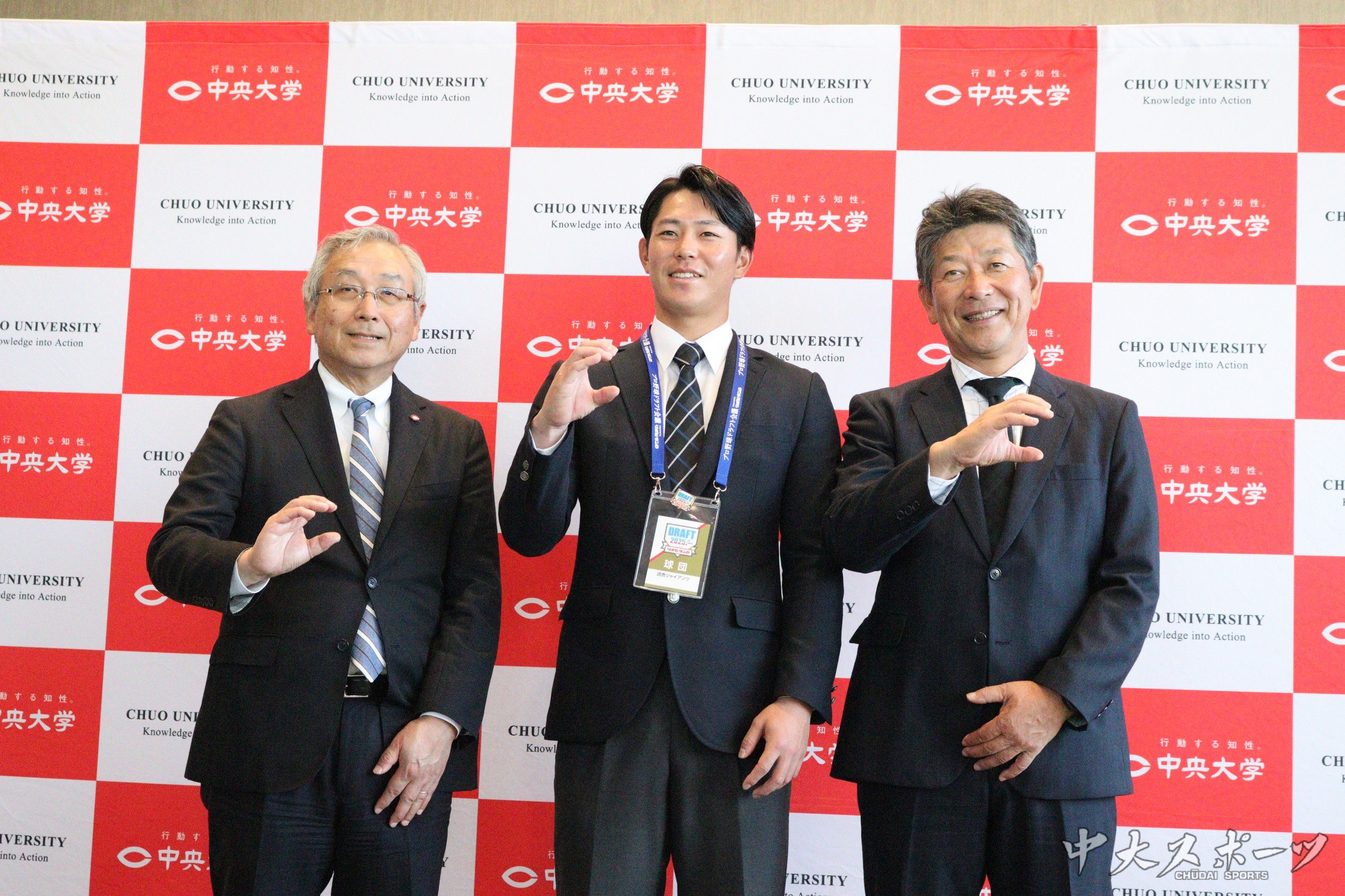 「ただいまご紹介いただきました、中大硬式野球部部長をしております樫山和男です。先ほど東京読売ジャイアンツ様に皆川くんが指名をいただいたところでございますが、ご指名いただきまして本当にありがとうございました。今日は多くの報道関係者の皆様にお集まりいただきまして、ありがとうございます。皆川くんは高校野球を経て大いなる期待を持って中大に来ていただきました。1年生の時からレギュラーで、その結果4年間で100安打。東都96年の歴史の中で25人目ということで、(過去に東都で)100安打を達成した中大卒の選手で言いますと、最近では現在読売ジャイアンツでコーチをしております亀井(善行=平17卒)コーチ以来ということで非常にうれしいなと思っております。皆川くんも走攻守そろっておりまして、けがも本当に少ない選手ですので、プロに行ってもぜひ活躍してほしいです。高校時代からさかのぼってお世話になった方がたくさんいると思うんですけど、感謝の気持ちを持って大いに活躍していただき、阿部(慎之介=平13卒)監督も中央大学出身ですので、ぜひ優勝を目指してもらいたいなと思います」