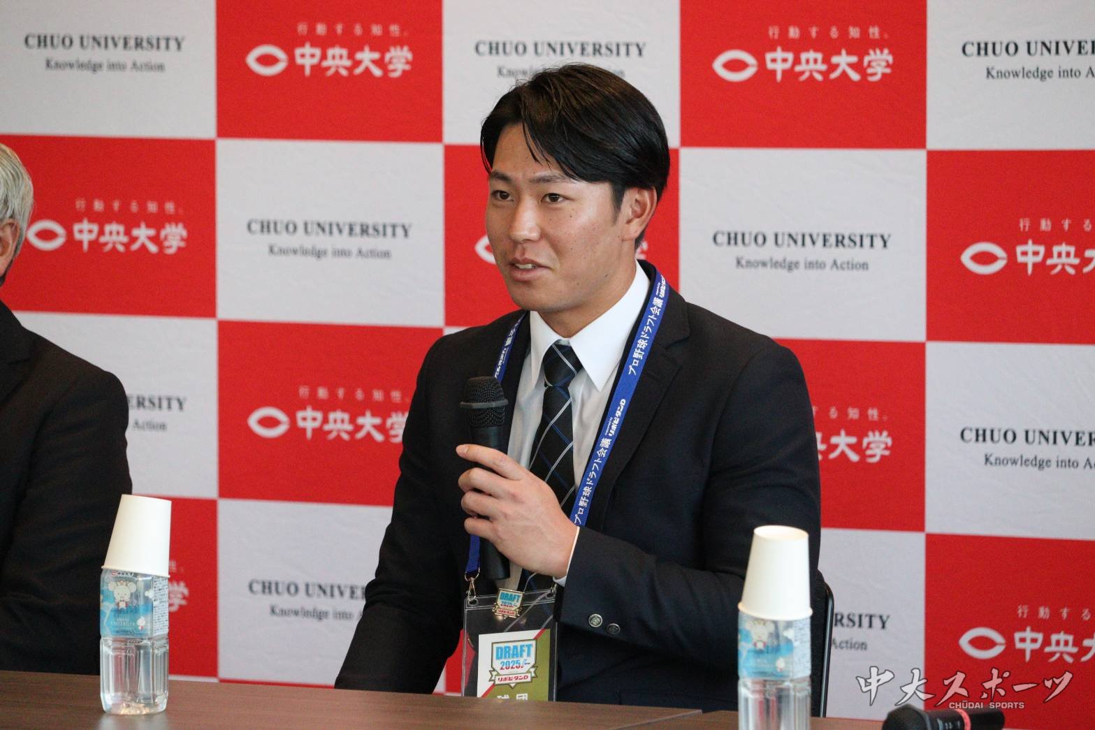 「中央大学硬式野球部監督の清水です。本日はご指名のあいさつに来ていただき、また、お忙しい中このような会を開いていただき、報道関係者の皆様もたくさん足を運んでくださいましてありがとうございます。皆川に関しましては、先ほど部長も触れられましたように1年生の頃から試合に出まして、4年生になった今年は特にすごく成長したんじゃないかなと。特にメンタルの部分でしっかりしました。また、先ほどの話がありましたように100安打を達成しまして、ジャイアンツさんから指名され、うれしく思います。プロに行っても阿部監督や亀井コーチ、会田(有志=平18卒)コーチや西舘(勇陽=令6卒)くんだったり、たくさんの中大OBがいますので、早い段階からレギュラーになってもらえるように応援してますので頑張ってください」