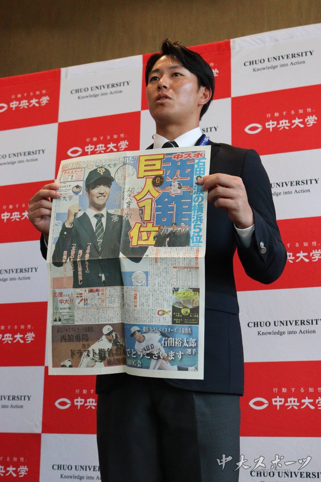 ドラフト会議で読売ジャイアンツ(以下、巨人)より4位指名を受けた皆川岳飛(経4=前橋育英)への指名あいさつが行われた。