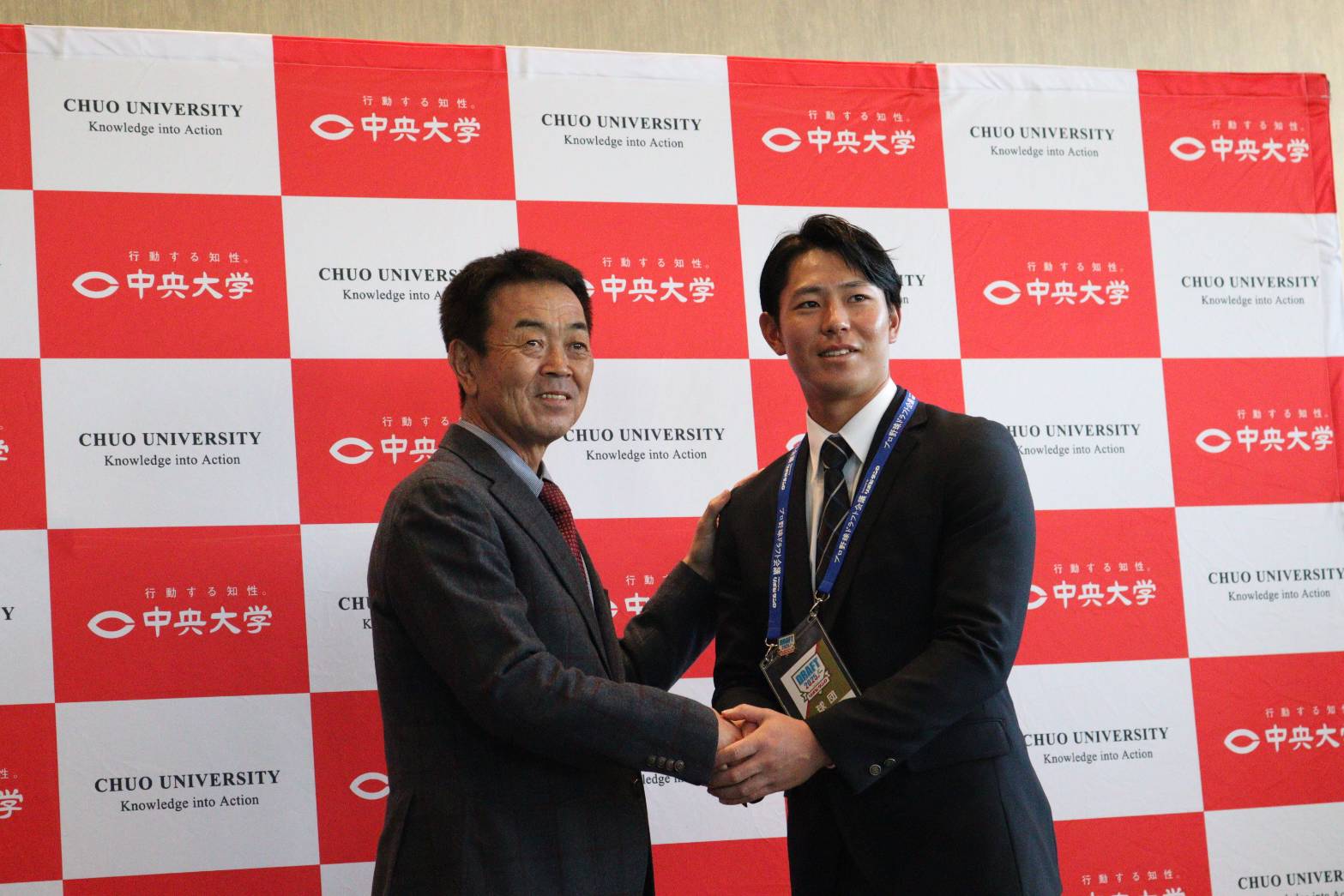 「中央大学硬式野球部監督の清水です。本日はご指名のあいさつに来ていただき、また、お忙しい中このような会を開いていただき、報道関係者の皆様もたくさん足を運んでくださいましてありがとうございます。皆川に関しましては、先ほど部長も触れられましたように1年生の頃から試合に出まして、4年生になった今年は特にすごく成長したんじゃないかなと。特にメンタルの部分でしっかりしました。また、先ほどの話がありましたように100安打を達成しまして、ジャイアンツさんから指名され、うれしく思います。プロに行っても阿部監督や亀井コーチ、会田(有志=平18卒)コーチや西舘(勇陽=令6卒)くんだったり、たくさんの中大OBがいますので、早い段階からレギュラーになってもらえるように応援してますので頑張ってください」