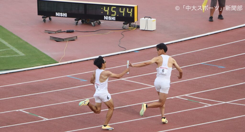 1走は庄籠大翔 (法2) 。早大の1走とラップタイムで互角に張り合うという、自信になるレースを展開した。2走を務めたのは今大会の400m決勝で自己ベストを出した齋藤結輝(法1)。300m地点で早大に追いつき、1位に浮上。 自身の走りから「1番に持ってこれて良かった」としながらも「もっと差をつけて渡したかった」と振り返った。