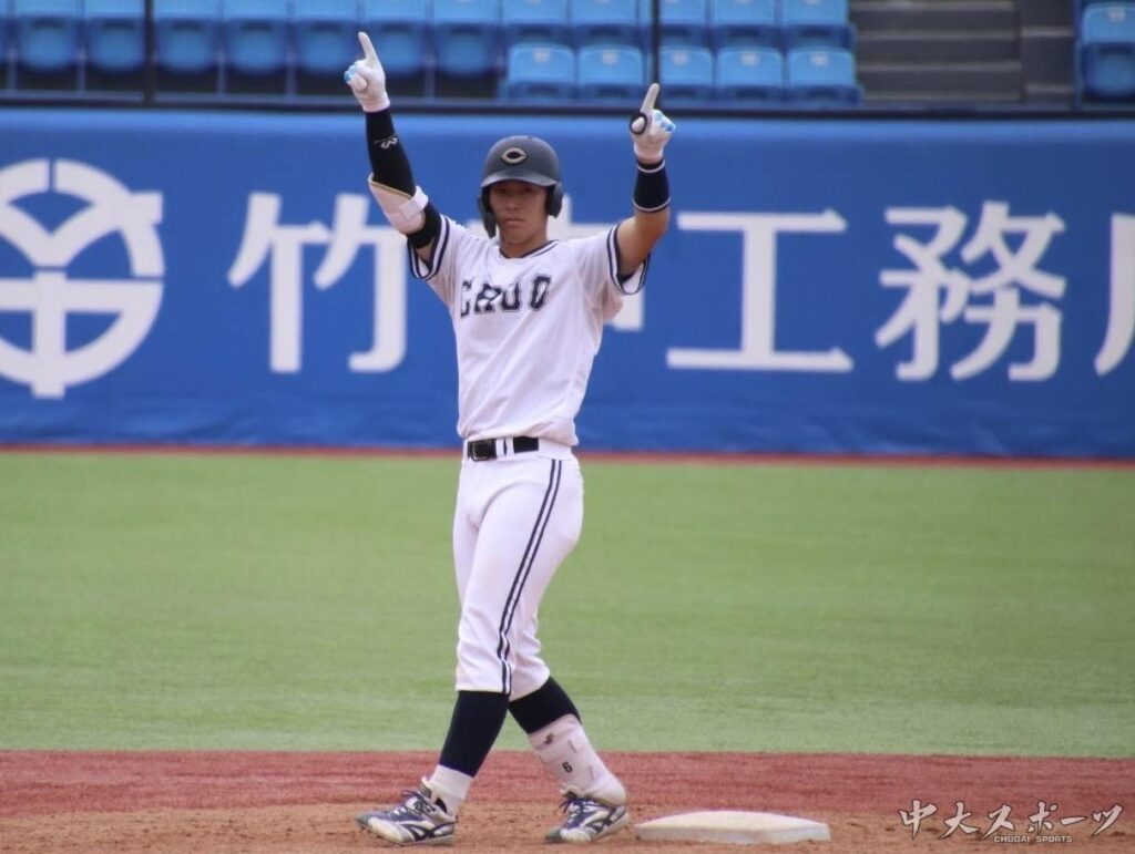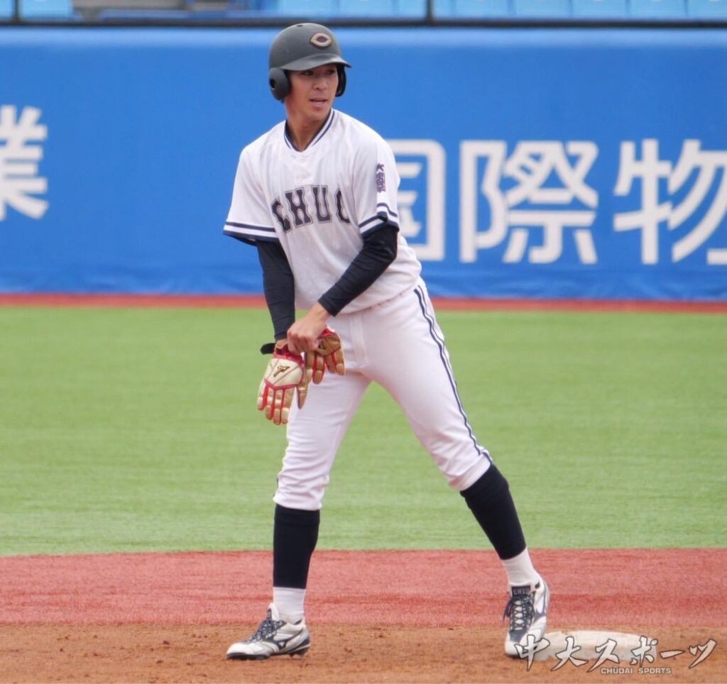 5回の中大の攻撃、安田、藤本の安打でチャンスを作ると、佐藤壱の早くも本日3本目となる安打は適時打に。この回さらに皆川にも適時打が飛び出し点差を8点に広げる。