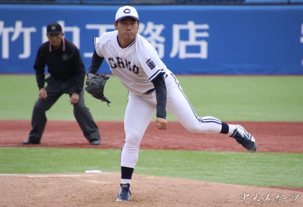 中大先発の岩城は「味方が先制してくれたので、気持ち的に楽に投げることができた」と初回から140㌔中盤の直球と鋭く曲がるスライダーのコンビネーションで走者を出しながらも無失点で抑える。
