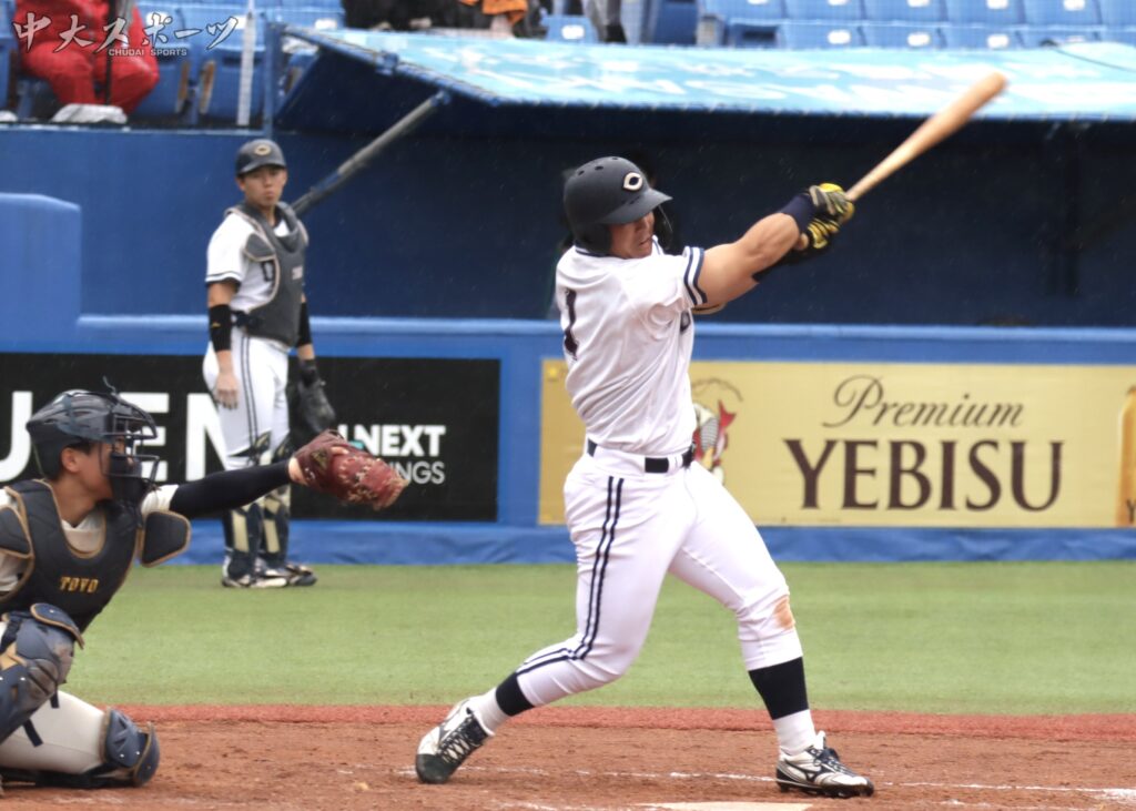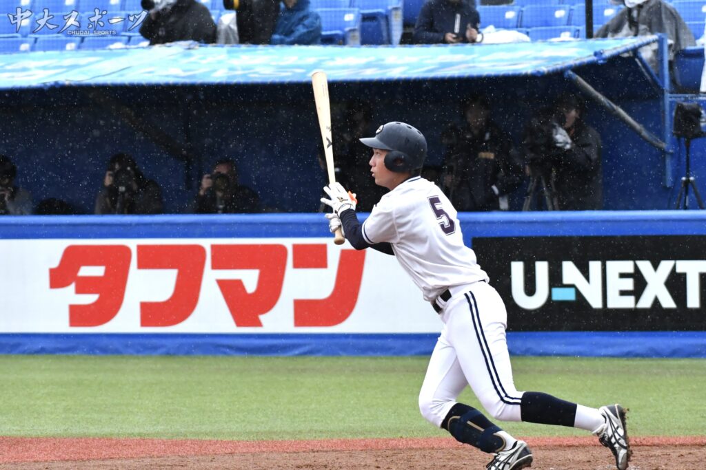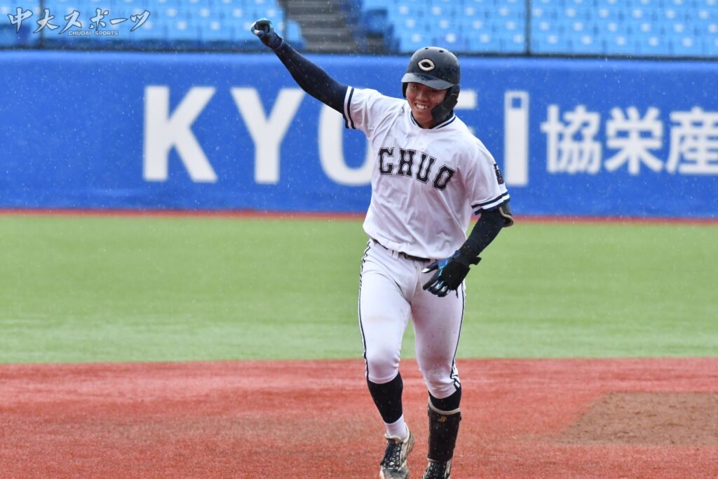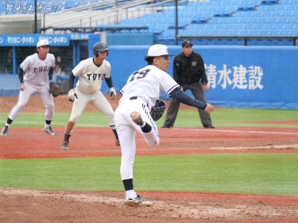 序盤から勢いに乗る中大打線は、相手の隙に付け込み突き放しにかかる。3回表、青木が2打席連続ヒットで出塁すると、皆川と繁永が死球を受ける。1死満塁で続く松嶋晃が四球を選び1点追加。さらに安田のサードゴロの間に1点。点差を4に広げた。