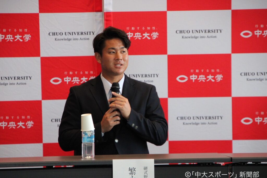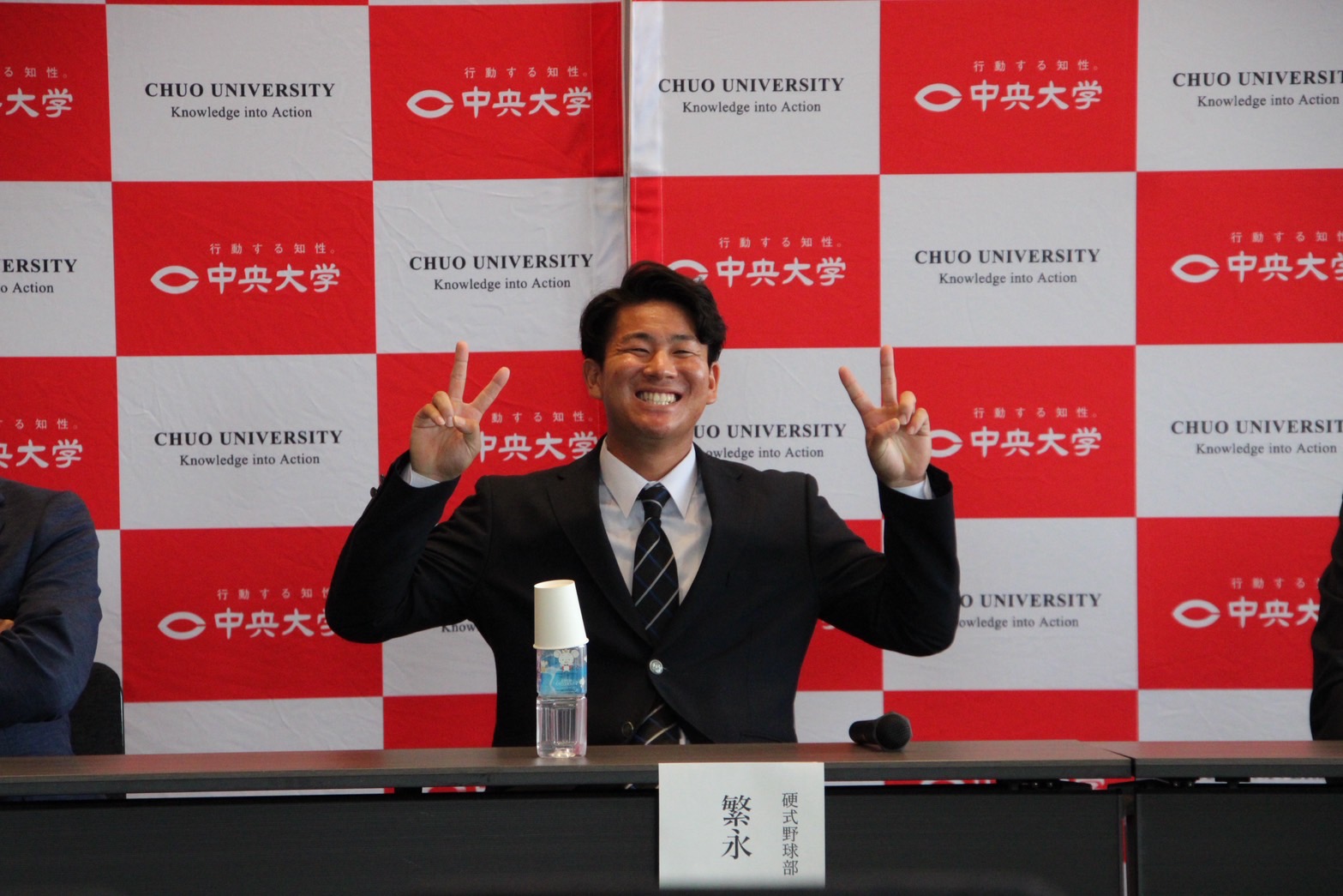 「ただいまご紹介いただきました、野球部長しております樫山でございます。先ほど楽天イーグルスの皆様よりですね、指名のご挨拶をいただいたところでございますが、本当にご指名いただきまして本当にありがとうございました。また今日は、休日でありますけれども、多くの報道の皆様、お集まりいただきまして、本当にありがとうございます。繁永君はキャプテンという重責を担っている訳ですけれども、非常に明るくですね、私も数年、見させていただいていますけれども、明るいキャラでですね、本当にチームのムードメーカー的な存在で。繁永君の名前の晟って、珍しい名前だなと思って、色々意味を調べたら、明朗快活というような言葉が出てきて、まさにそのような活躍かなというふうに、思った次第でございます。内野手として期待しているということですので、ぜひ色々な方々への感謝の気持ちを忘れずにですね、まず一軍に上がって期待に応えられるように頑張ってください」