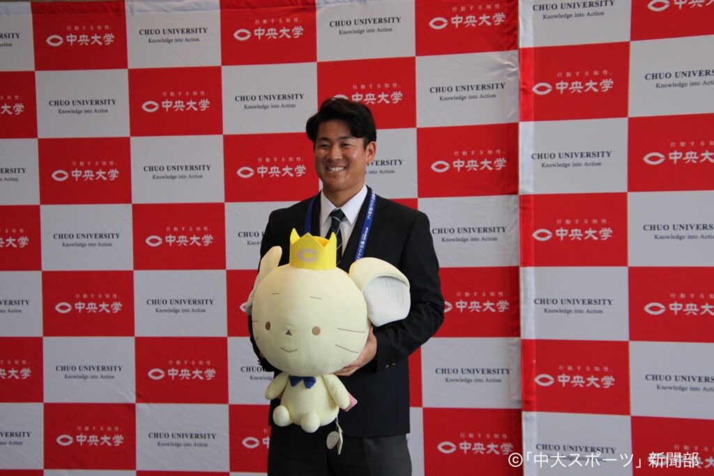 ▲中央大学のマスコットキャラクターであるチュー王子を手に持ち撮影に応じる繁永