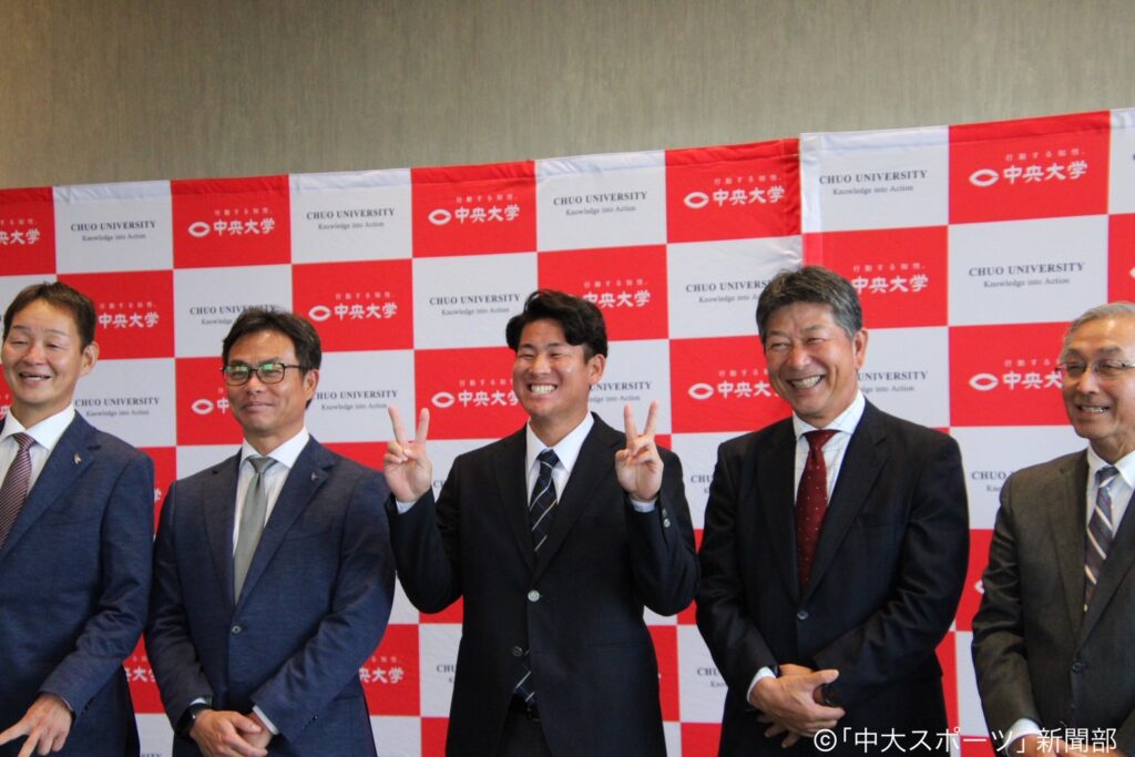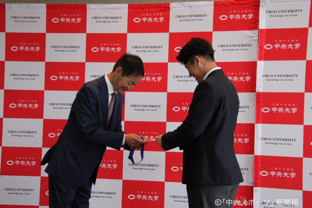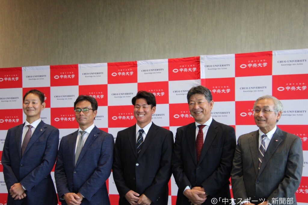 先日のドラフト会議で東北楽天ゴールデンイーグルス(以下、楽天)より3位指名を受けた繁永晟(商4=大阪桐蔭)への指名挨拶が行われた。楽天からはスカウト部アマスカウト担当 部坂俊之、スカウト部部長 愛敬尚史が訪問。中大野球部からは繁永に加え、清水監督、樫山部長が出席した。