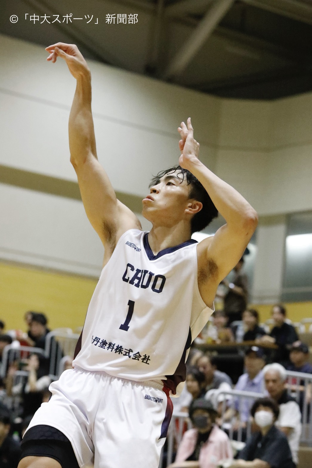第2Qは三谷、#1久岡賢太郎(商4)の連続3点シュートから始まった。カッターのリバウンドからパスを受けた宮内が3点シュートを決め、会場を沸かせる中大。前半1回目のタイムアウトを取った後、日大の連続得点により3点差まで追いつかれるも石口が3点シュートを2本決め点差を広げ、41ー33で前半を終える。