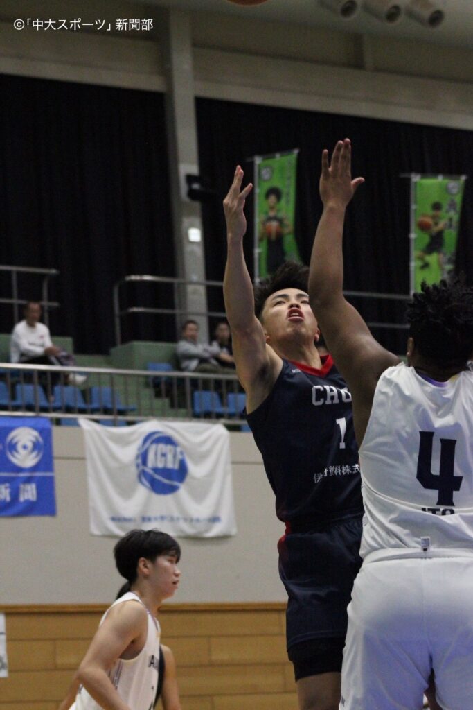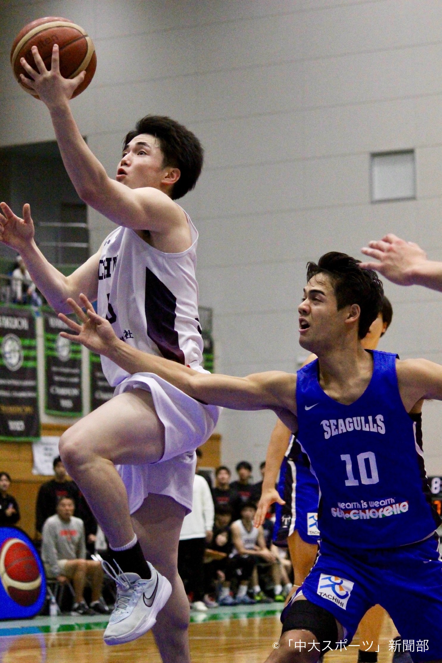 第1Qは高さのある東海大に対し、中大は外からの攻撃を中心に試合を組み立てた。開始早々から積極的に3点シュートを狙い、石口が3点シュートを沈めると、自らドライブで留学生をかわし、中からも得点。勢いづいた中大は、鴫原や#1久岡賢太郎(商4)も続けて3点シュートを決め、1点リードで第2Qへ。