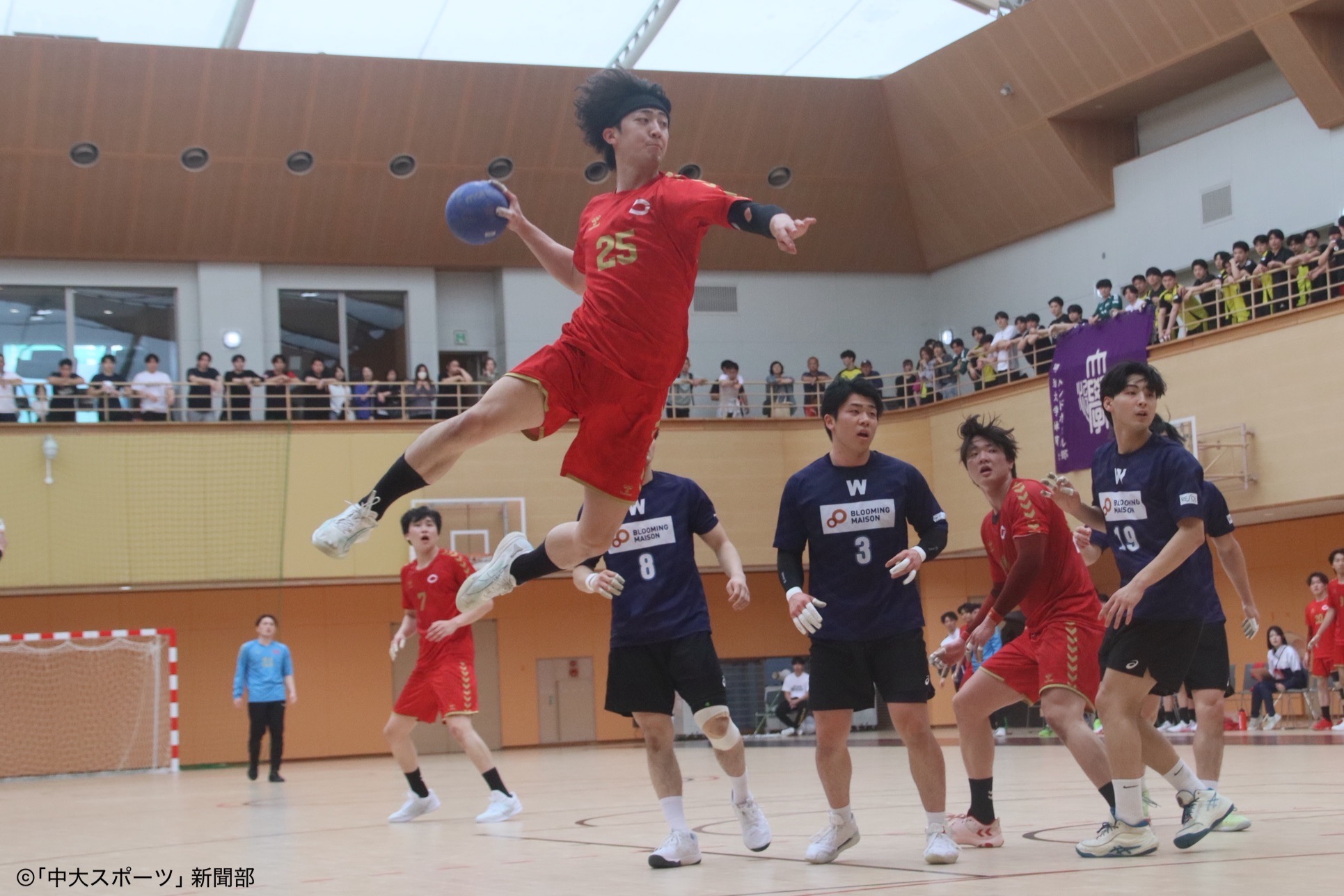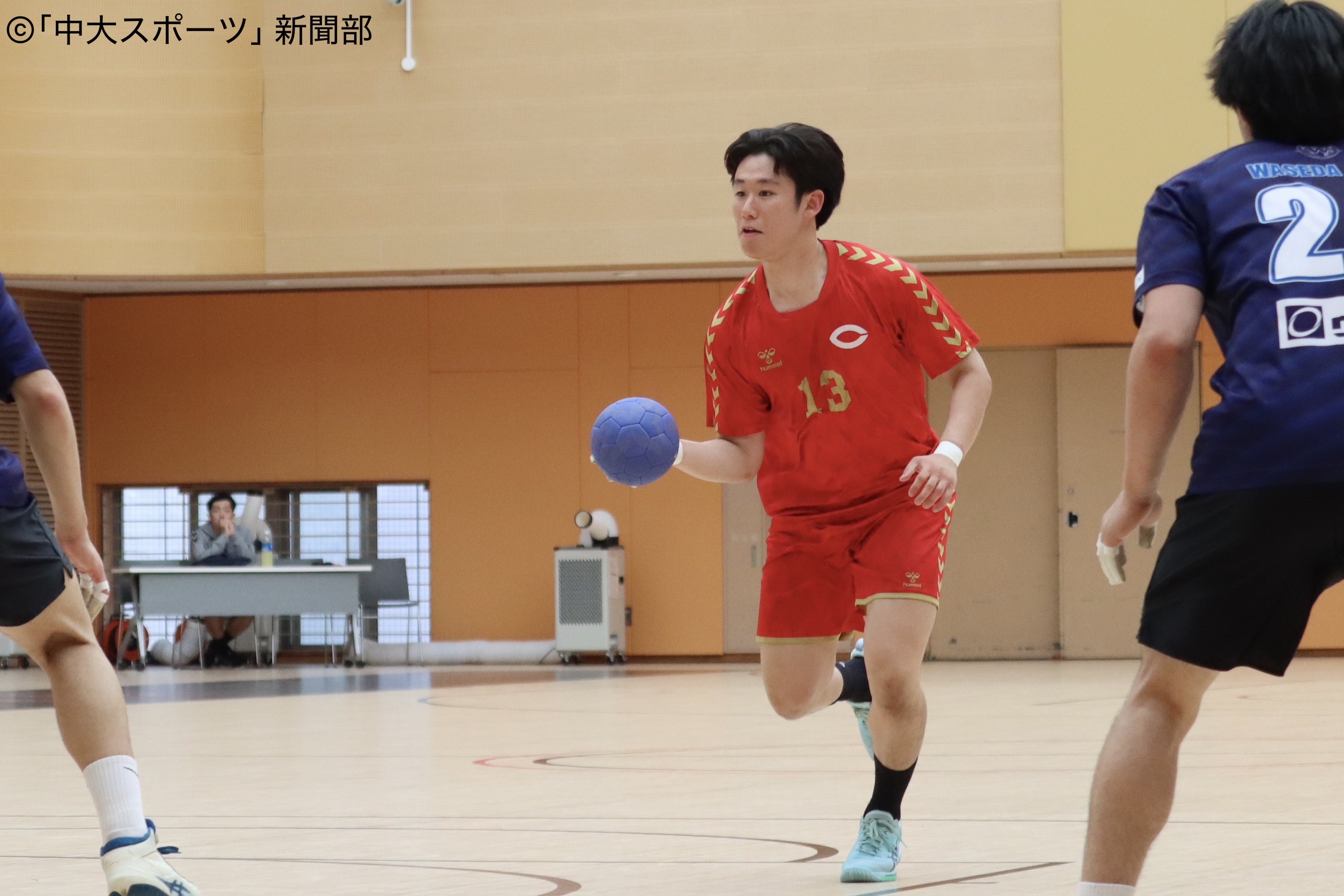 前半、中島大智(文4)、原有彌(経4)が相手GKの守備をくぐり抜ける巧みなシュートを決める。3分頃から藤川淳(法4)のシュートを皮切りに、中大は5連続得点を挙げて点差を引き離していく。その後は相手の速攻からのサイドシュートを決められ、点差を縮められるも、逆転は許さない。持ち前のディフェンス力で相手の速攻を阻み、得点を積み重ねていく。古澤宙大(法2)は相手ディフェンスに切り込み、体勢を崩しながらも連続シュートを決めた。リードを保って20-14で前半を折り返す。