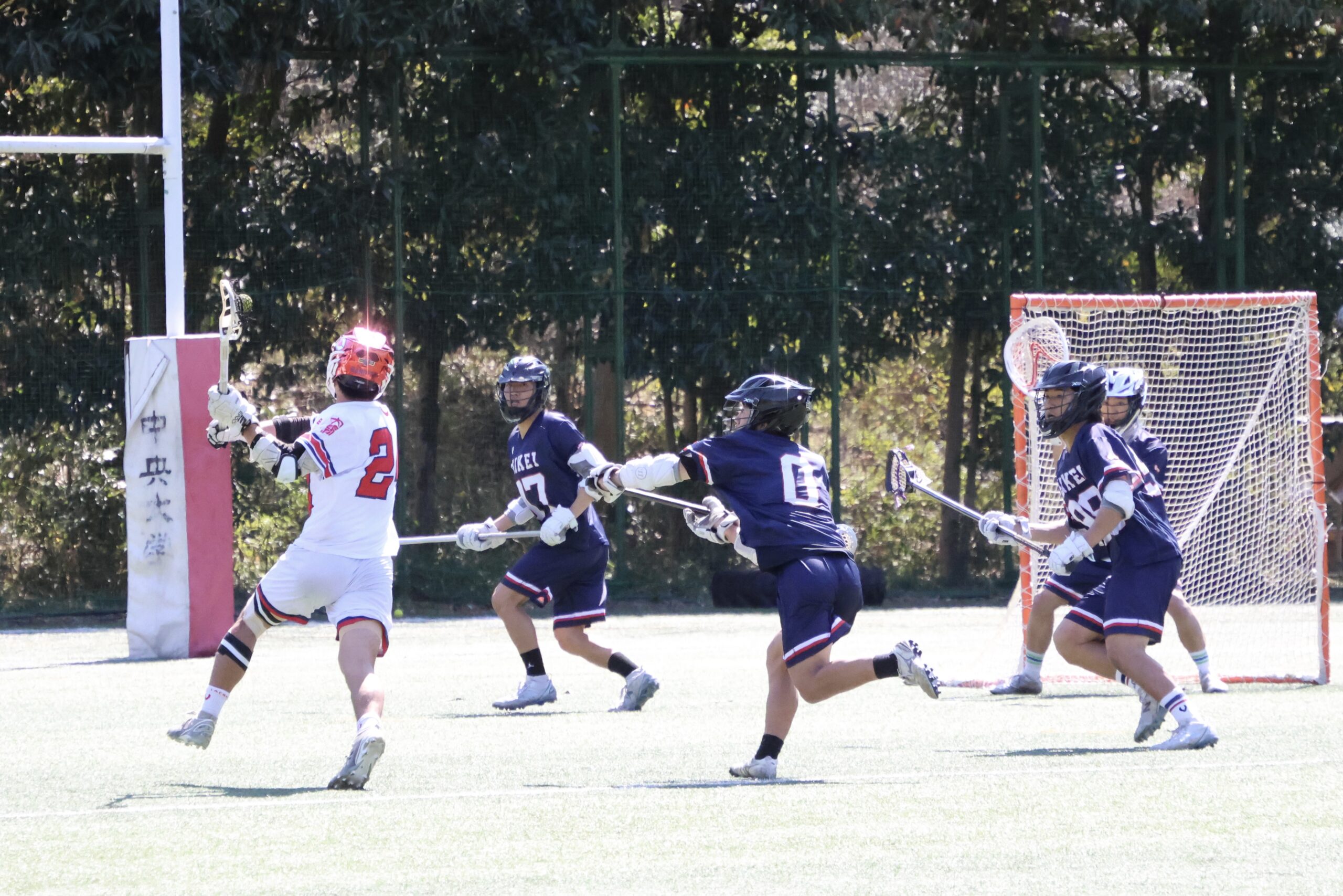2月に開幕した関東ラクロス春の最強決定戦。Aブロックに6校、Bブロックに9校が振り分けられ、それぞれ上位3校がトーナメント出場権を得る。Bブロック1位通過を狙う中大は初戦の対日体大戦を引き分け、2回戦の対学習院大戦では勝利した。迎えた3回戦の相手は成蹊大。第1クオーター(以下、Q)から得点を重ねてリードする展開が続き、永田晴一(総政2)が3得点、八幡颯一郎(国経2)が2得点を挙げるなどして7-3で勝利した。