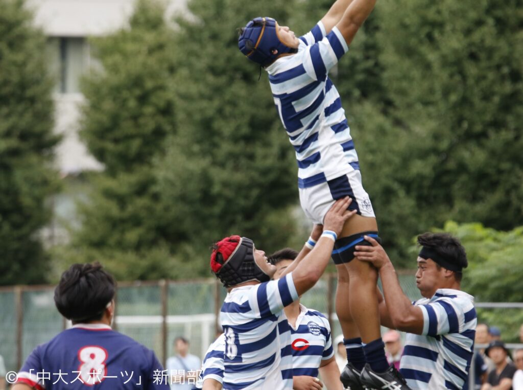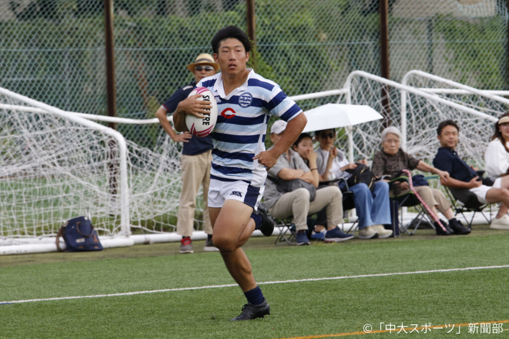 前半終盤に中大は連続トライで相手を突き放す。相手ボールからのラインアウトのスローインボールをカット。ボールは須田龍之介に渡るとそのままゴールまで駆け抜けトライ。その直後も素早いパス回しで連続トライを決め、26対14で前半を終える。