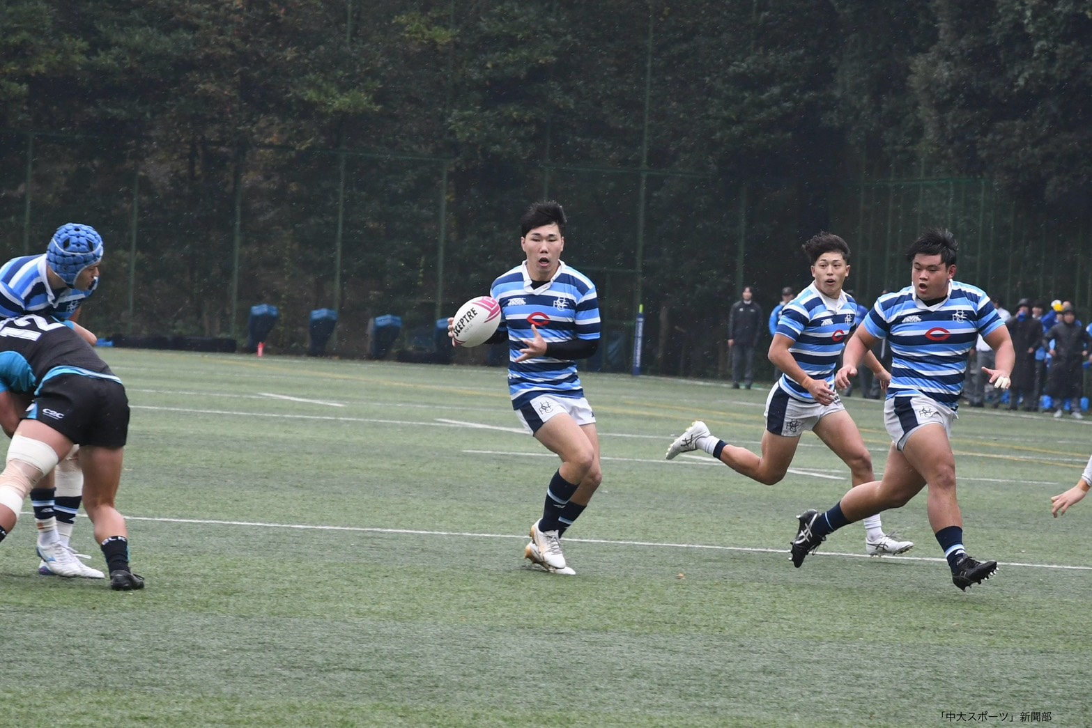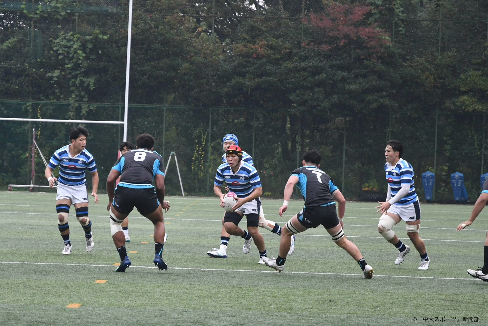 中大が攻めに転じると、愚直にトライ狙う。ラインアウトで山梨学院大にボールが渡るも、百瀬祐主将(理工4)が奪い返すと、田積智陽(法4)、吉田晃己(法2)がつないで、島﨑聖弥(経3)へパス。大外から駆け上がり、トライラインへ辿り着くも、ボールを離したと判定され、トライとはならなかった。しかし、このプレーで勢い付いた中大。須田龍之介(法3)のキックパスの落下点めがけて、田積が走り込み、トライを試みる。パスは通らなかったものの、得点の兆しを見せた。