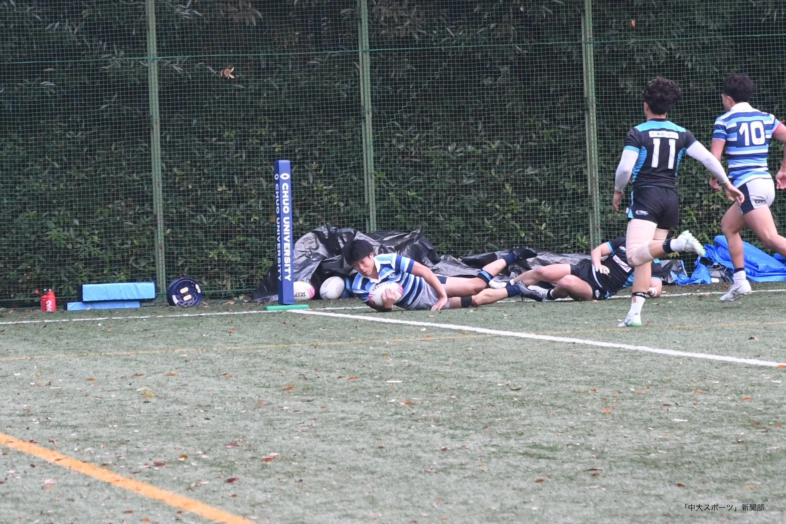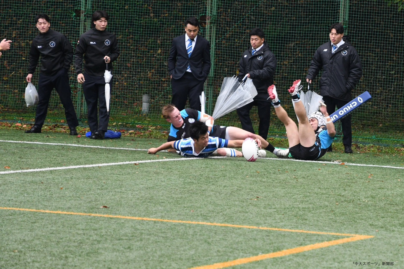 再び耐える時間となった中大。スクラムで山梨学院大を場外へ押し出し、失点を防ぐ。しかし、開始28分、ショットで先制点を許してしまう。さらに、開始34分、トライを決められてしまった。10点差となるも、わずか3分後、ラインアウトから一歩一歩着実に近づき、最後は堂薗昴修(法4)がトライ。3点差迫る。