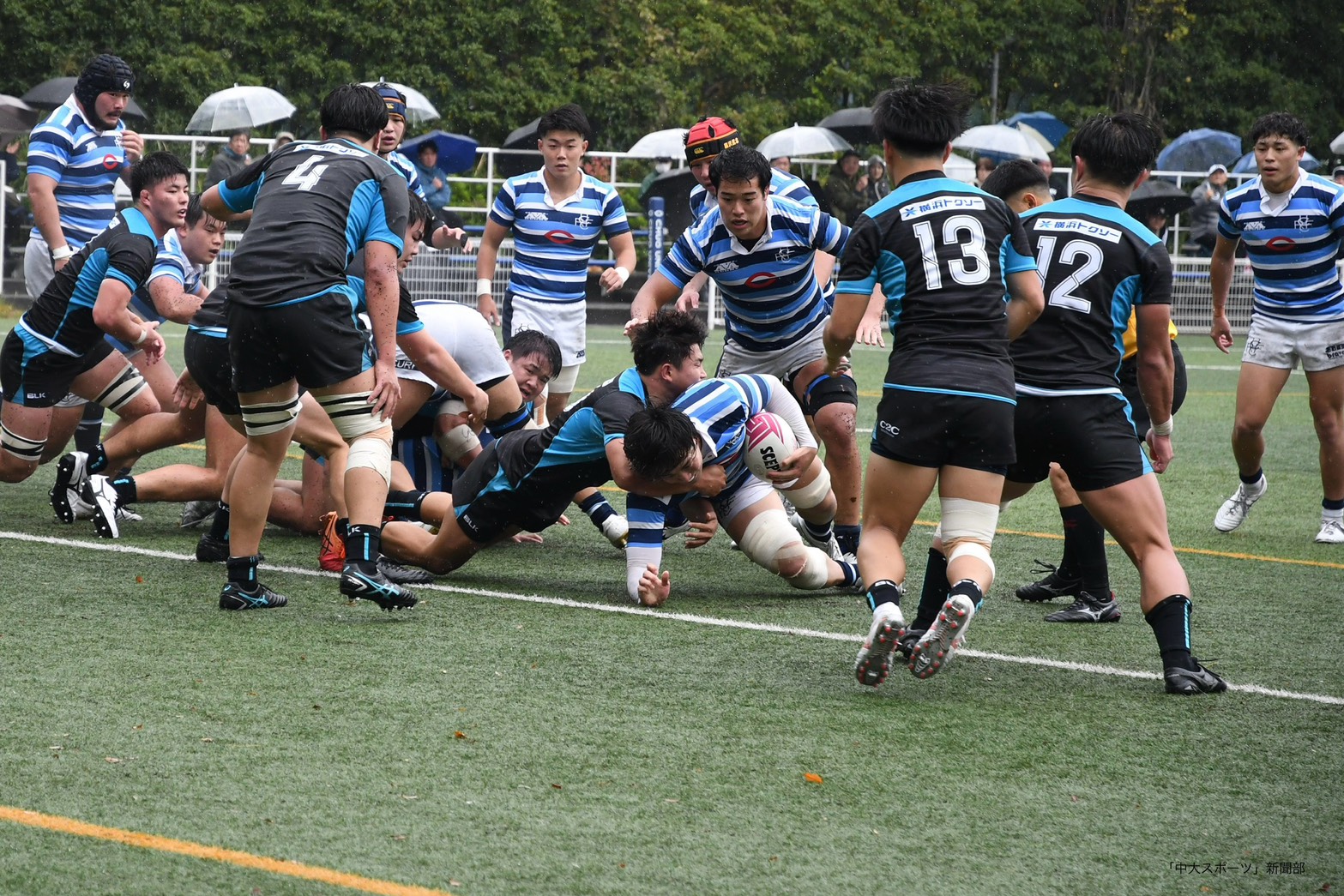 第6戦の相手は、昨年のリーグ戦で敗北を喫している山梨学院大だ。中大はフォワードが躍動。モールから一人、また一人と体当たりして2トライを奪った。取られては取っての接戦を制し、2点差で勝利。最終戦を残して入れ替え戦進出を決めた。