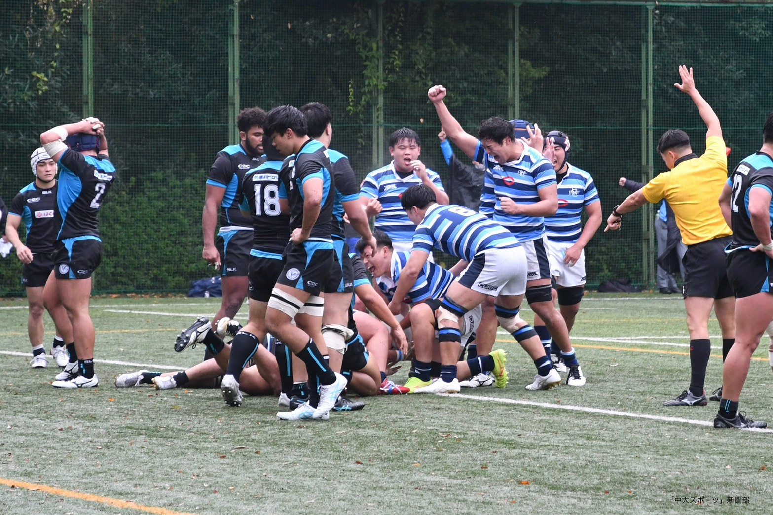 後半33分、トライを阻止できず、再びリードを奪われてしまう。しかし、山梨学院大のノックオンにより、ラインアウトで再開すると、中大はモールで前進。北田優人(文1)がトライに成功し、再び逆転した。試合終了間際、ラインアウトの連携ミスで、山梨学院大にボールが渡り、ピンチに陥った中大。ぎりぎりのところで防ぎきり、終了を告げるホイッスルとともに歓喜の声を上げた。