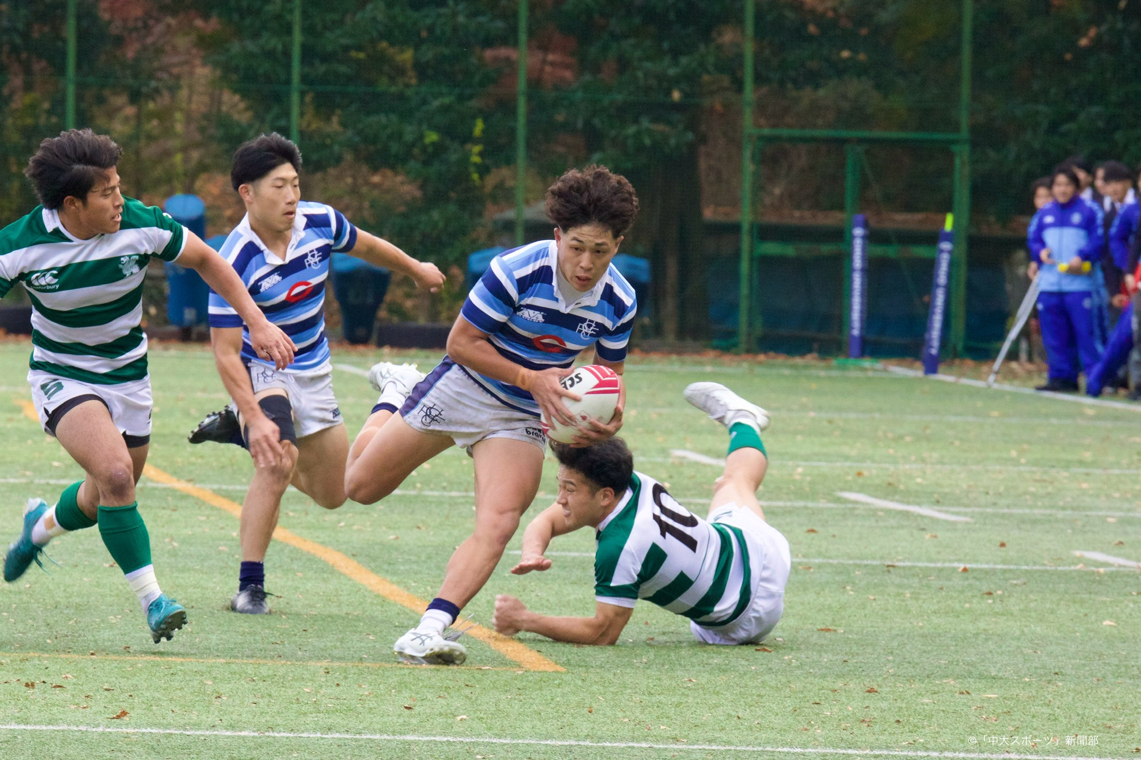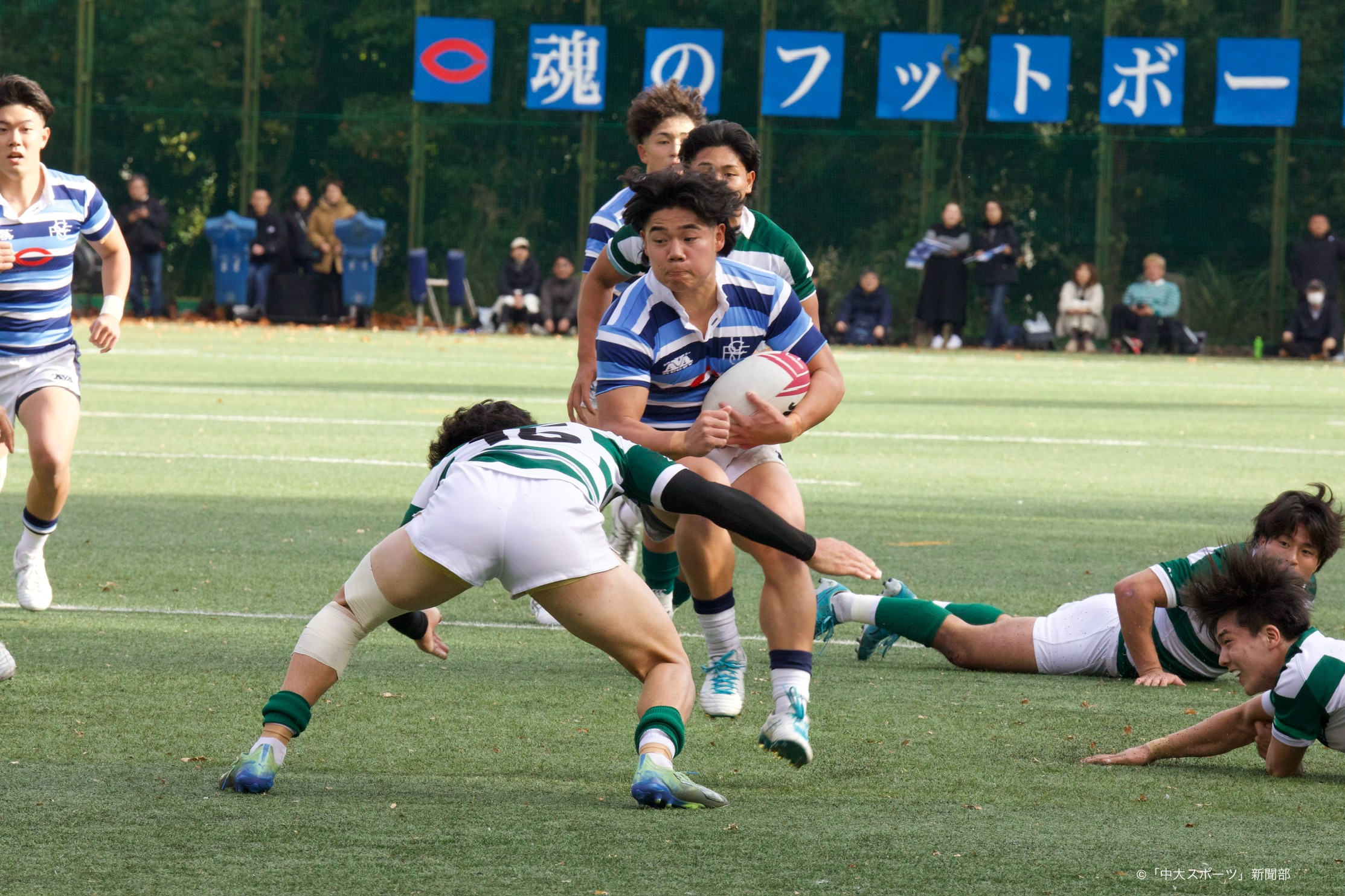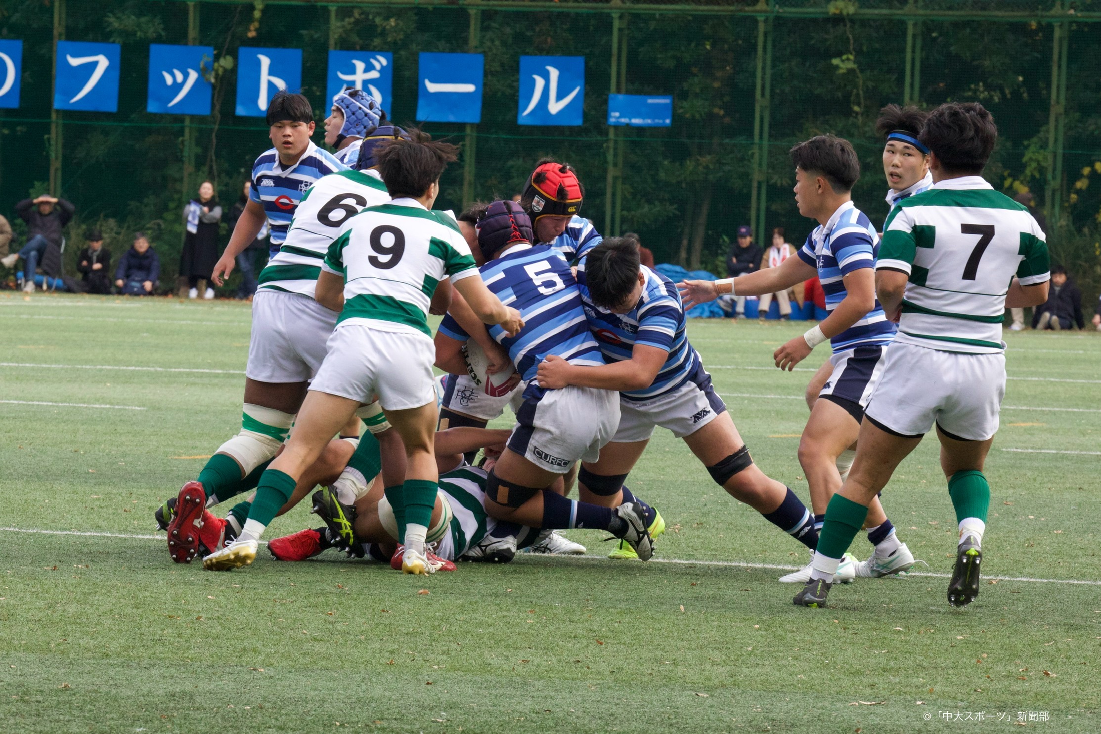 リーグ戦2部最終戦。これまで無敗の中大、専大は、全勝優勝をかけて試合に挑んだ。開始7分、迫中一斗(文3)がトライ。中大は先制するも、前半終了間際、守備の隙を突かれ同点に追いつかれる。中大は、後半38分、ドロップキックにより逆転されるも、後半39分、ペナルティキックで勝ち越しに成功。15―13という、ロースコアの接戦を制し、見事優勝を果たした。
