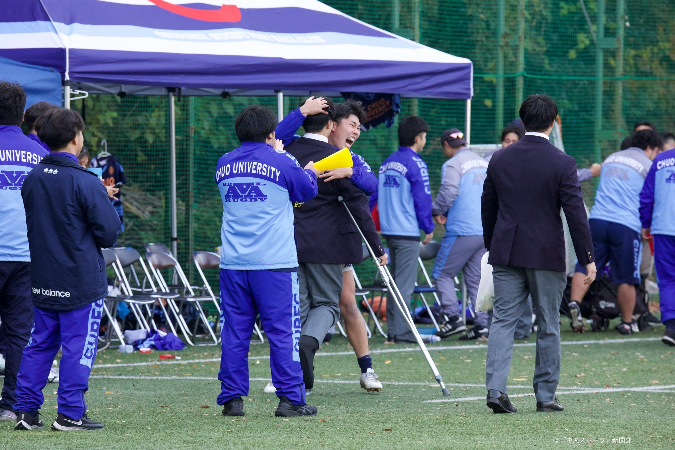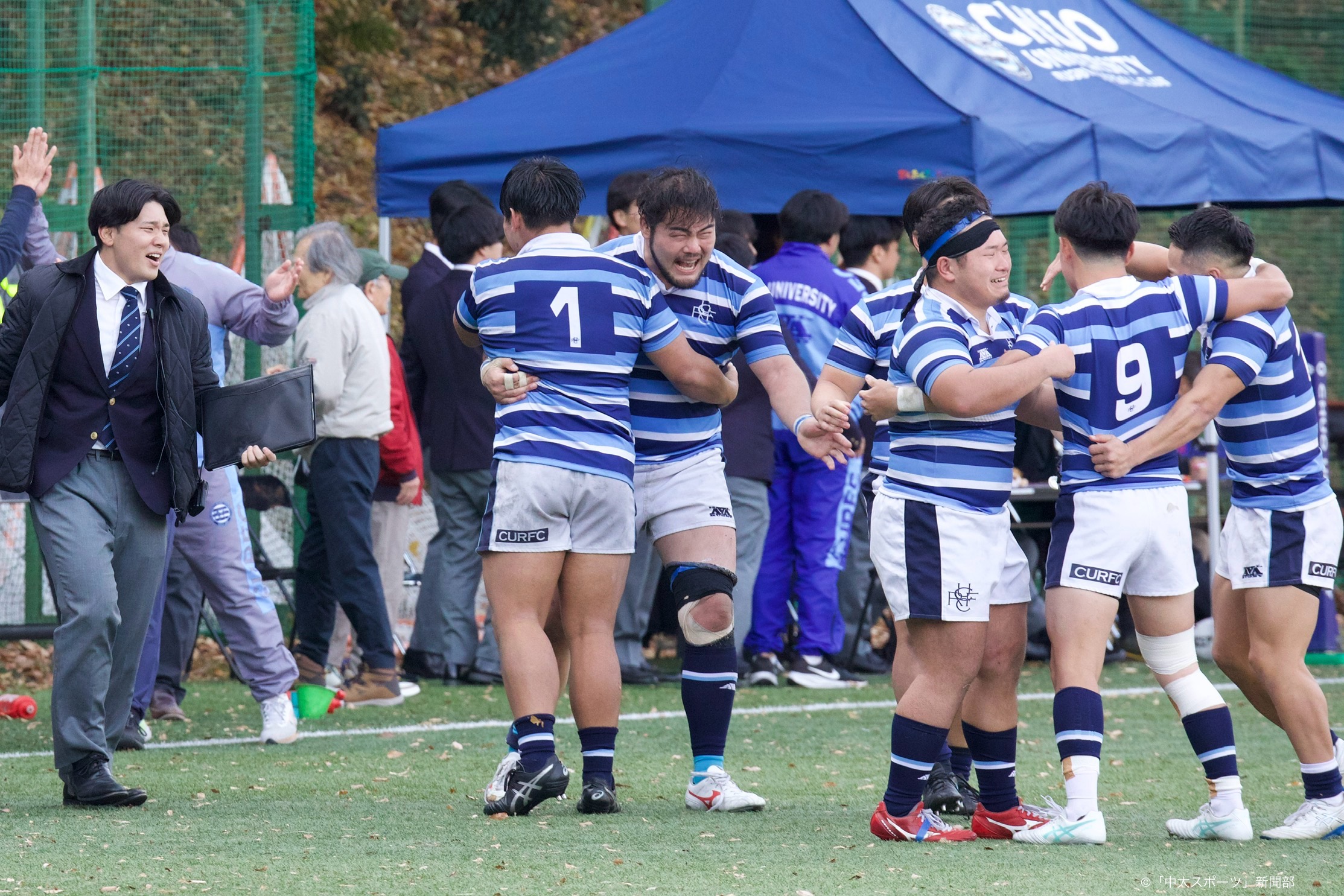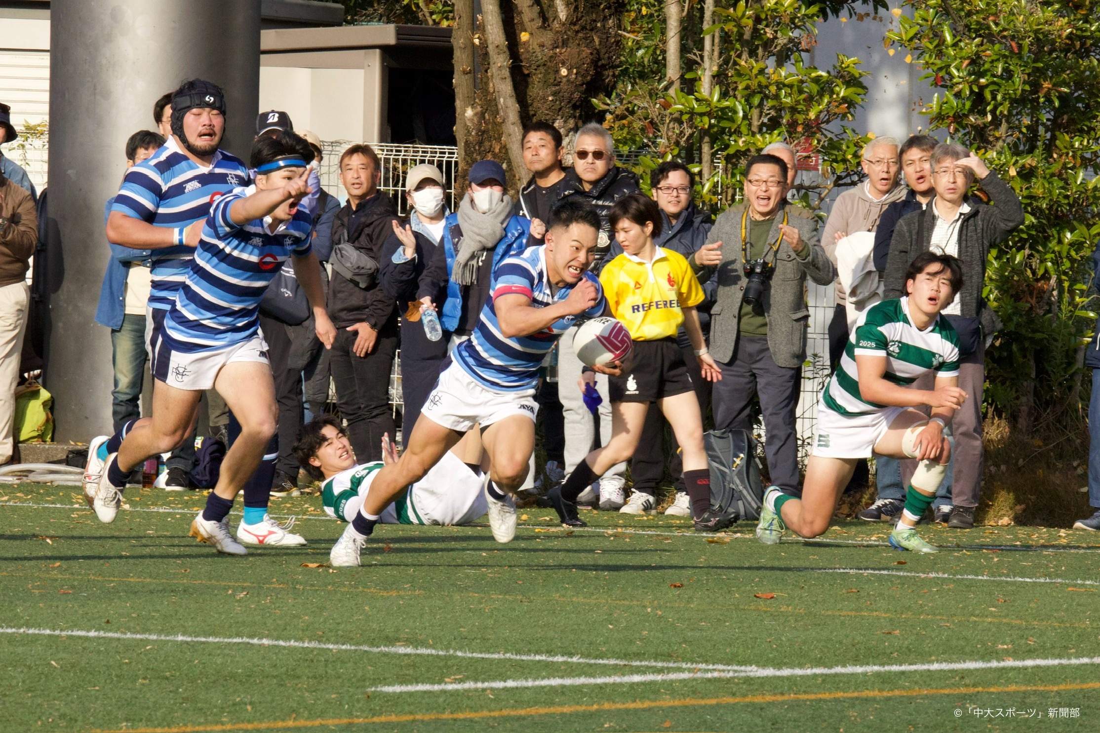 リーグ戦2部最終戦。これまで無敗の中大、専大は、全勝優勝をかけて試合に挑んだ。開始7分、迫中一斗(文3)がトライ。中大は先制するも、前半終了間際、守備の隙を突かれ同点に追いつかれる。中大は、後半38分、ドロップキックにより逆転されるも、後半39分、ペナルティキックで勝ち越しに成功。15―13という、ロースコアの接戦を制し、見事優勝を果たした。