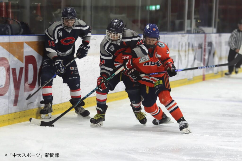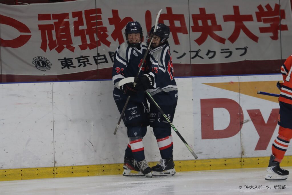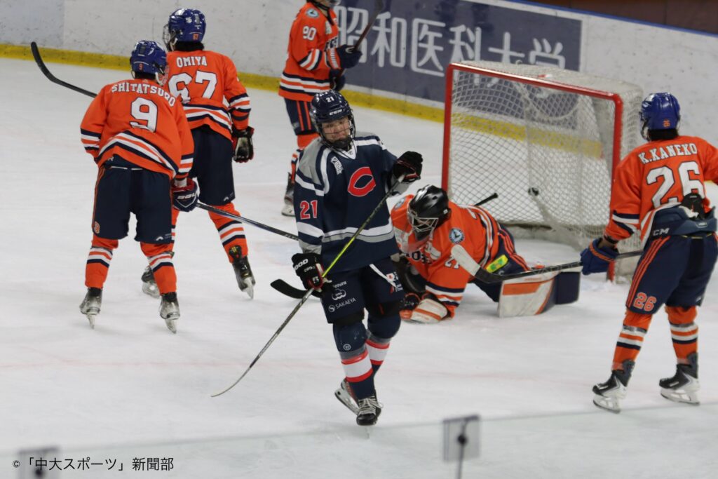 試合序盤に先制点を奪われてしまい追いかける展開となった。パックの取り合いが激化する中、横須賀大夢(総4)のアシストから関椋太(商1)が得点を決める。関の得点を皮切りに中大の勢いが加速していく。森星輝(文3)が力強いシュートを打つが惜しくも弾かれてしまう。しかし、ゴール際にポジションしていた中谷采士郎(総1)がパック押し込み得点をあげた。開始15分、関が相手からパックを奪い横須賀へパスする。横須賀はすぐさま中谷へ繋ぎ2得点目をあげ、3-1で第1ピリオドは終了した。
