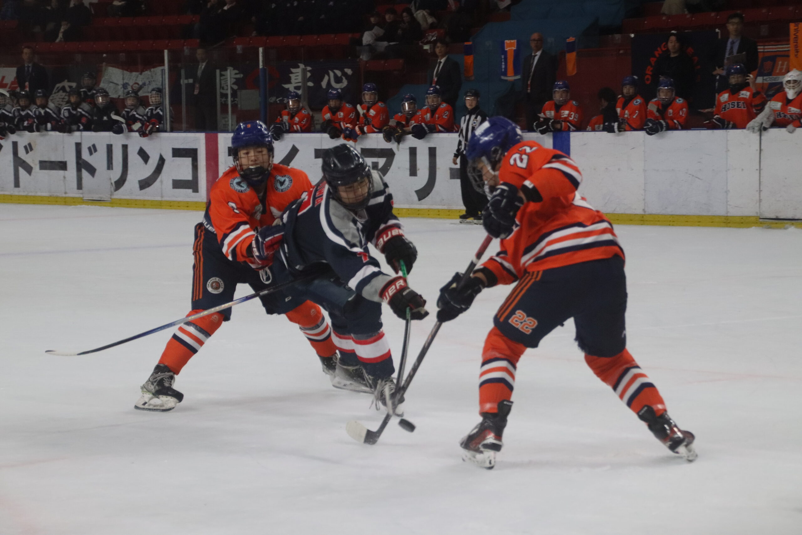 2点リードで迎えた第2ピリオド、中大が立ち上がりから主導権を握った。開始3分、森からのパスを受けた中谷が、キーパーとの1対1を冷静に沈め、貴重な3点目を獲得。さらにその直後、森のシュートが一度阻まれるも、こぼれ球に素早く反応した中谷がパスを送り、これを関が押し込んでゴール。一気に点差を広げ、中大の流れが来るかと思われた。しかし、ここで法大がタイムアウト。流れを断ち切ると、再開直後に法大がペナルティーを取られ、中大にパワープレーのチャンスが訪れた。この決定機を得点につなげきれずにいると、逆にパワープレー終了直後、法大が一気に勢いづいてゴールを決め、反撃の狼煙を上げる。さらに勢いに乗った法大は、その後も追加点をあげて点差を縮め、試合は再び緊迫した展開となった。