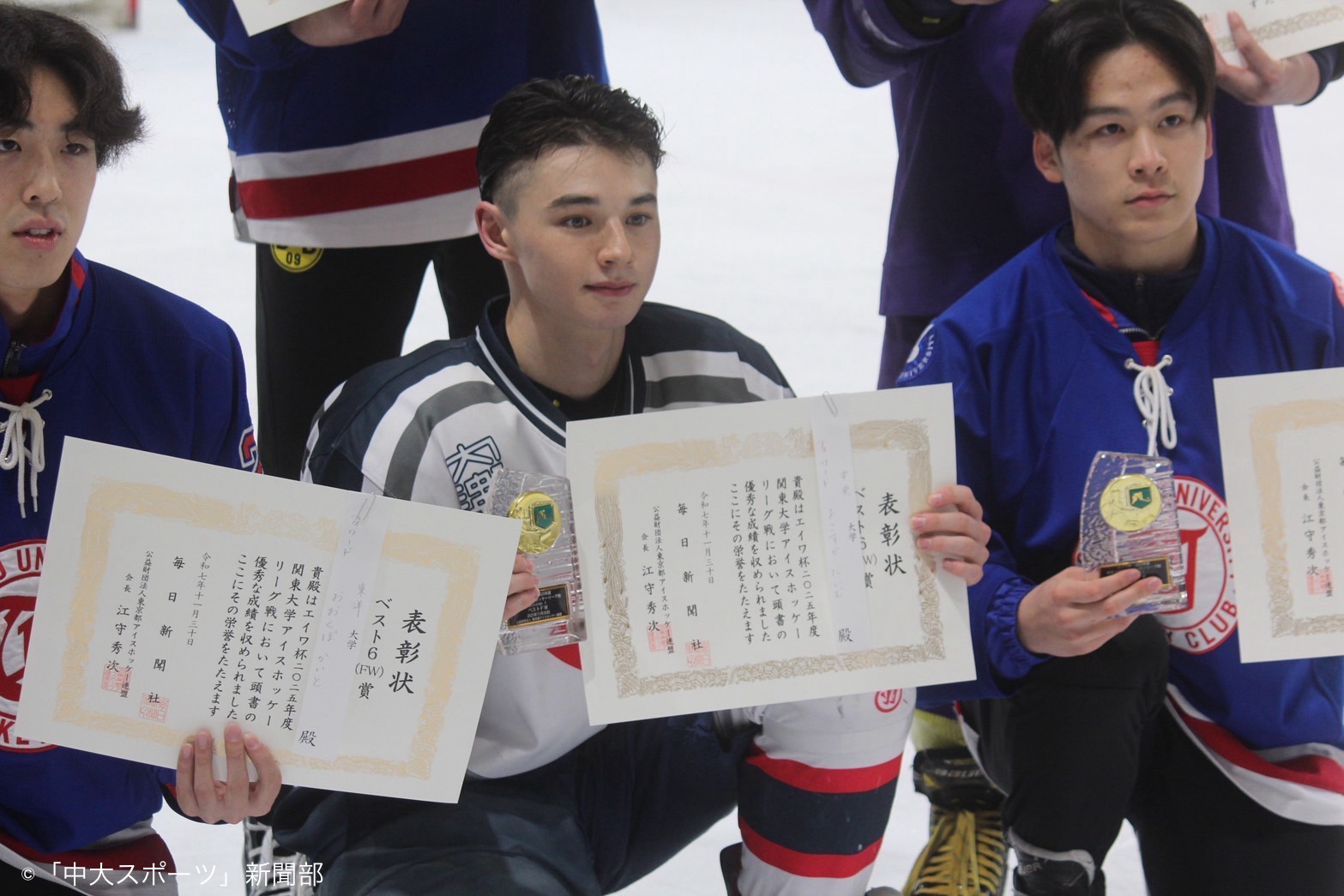 第3ピリオドもお互いに得点が入らず、拮抗状態となる。第2ピリオド同様に惜しい展開が何度も訪れるが得点は入らなかった。試合の展開が大きく動いたのは残り6分。角丸にチャンスが周り、シュートを打つ。見事得点となり同点に追いついた。続けて中谷采士郎(総1)のアシストから関椋太(商1)が得点を挙げ、逆転となった。しかし、明大も黙っていなく得点を挙げる。同点となり、試合は一進一退の攻防戦を繰り広げる。残り2分、パックの取り合いが激化する中、森星輝(文3)の鋭いパスを受け角丸がシュート。ゴールとはならなかったが、さらに横須賀が押し込み得点を挙げた。再び逆転となり、そのまま試合終了。4-3で見事勝利となった。