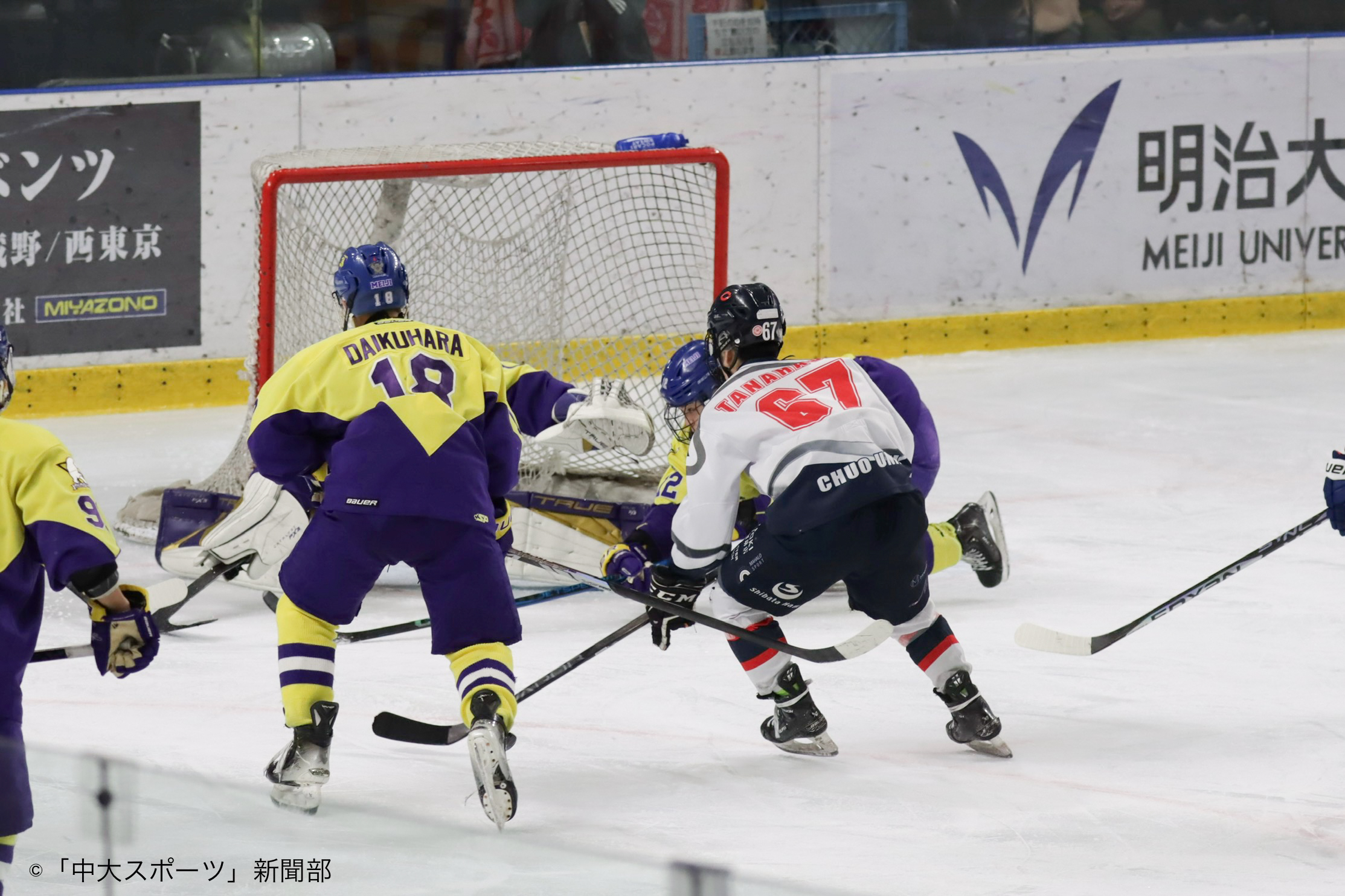 序盤からパックを繋げ、得点を試みるが、明大に阻まれてしまう。角丸陸斗(国経4)、横須賀大夢(総4)を筆頭にゴールを狙うが惜しくも得点にはつながらず。開始13分、守備が薄くなったところを突かれてしまい先制を許してしまう。続けて2得点目も挙げられしまい、早々に苦しい展開となった。しかし、残り3分、高崎泰成(総3)のパスから石塚弘人(経1)がシュートを打つ。止められてしまうも、さらに棚橋映斗(経2)が押し込み得点を挙げた。