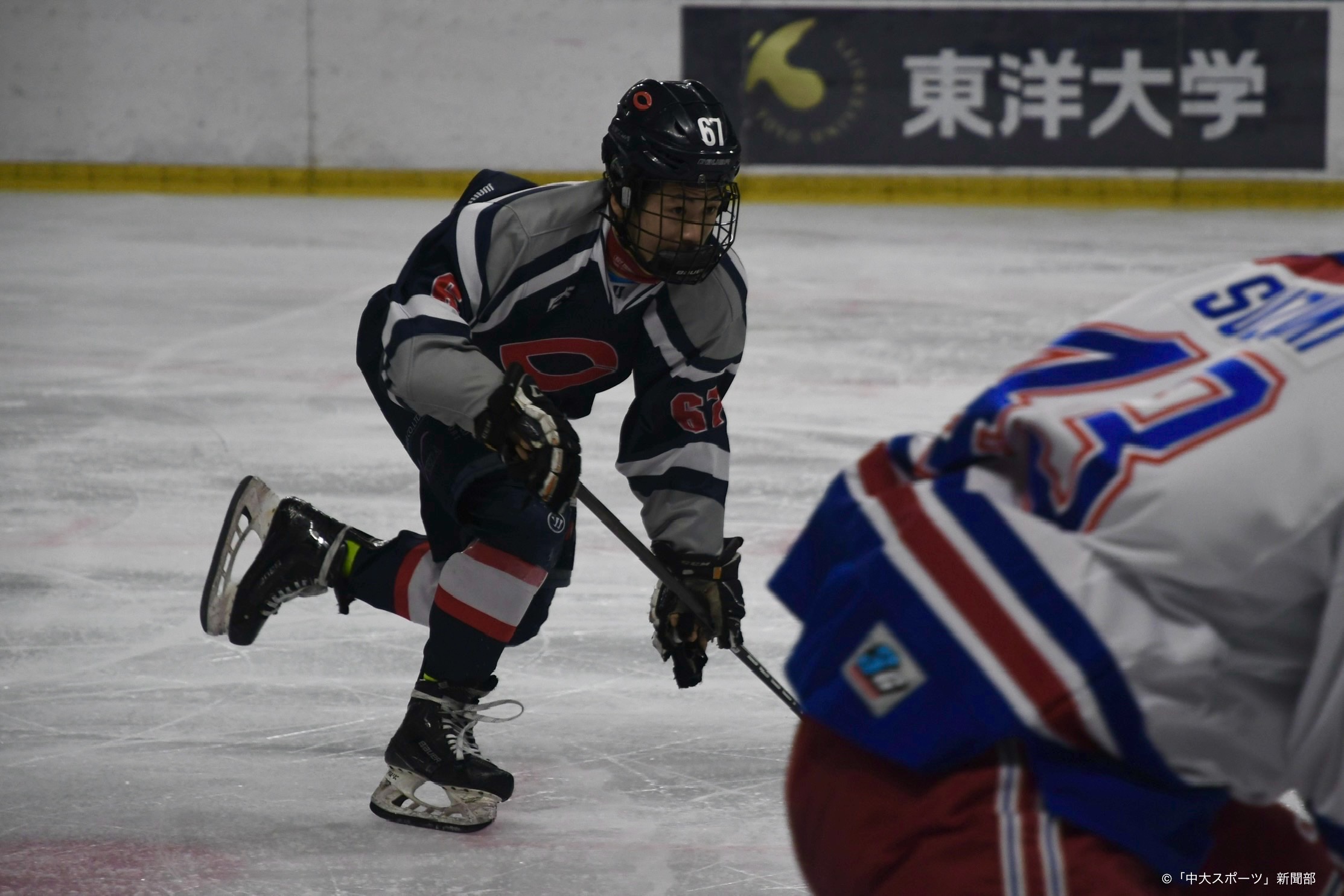 中大がなかなか点差を広げられない中、徐々に攻勢を強める東洋大。川合が3連続でシュートをキャッチ。鉄壁の守りを見せる。しかし、試合終了5分前に迫るころ、ゴール前の大混戦から東洋大が同点打を放った。調子を上げる東洋大に対し、下坪がパックを奪取し鈴木が打ち込む。続いて、スペースができたところに荒木が仕掛けた。さらに、関が振り向きざまにシュートを放つ。応戦する中大であったが、ゴールを捉えることができなかった。