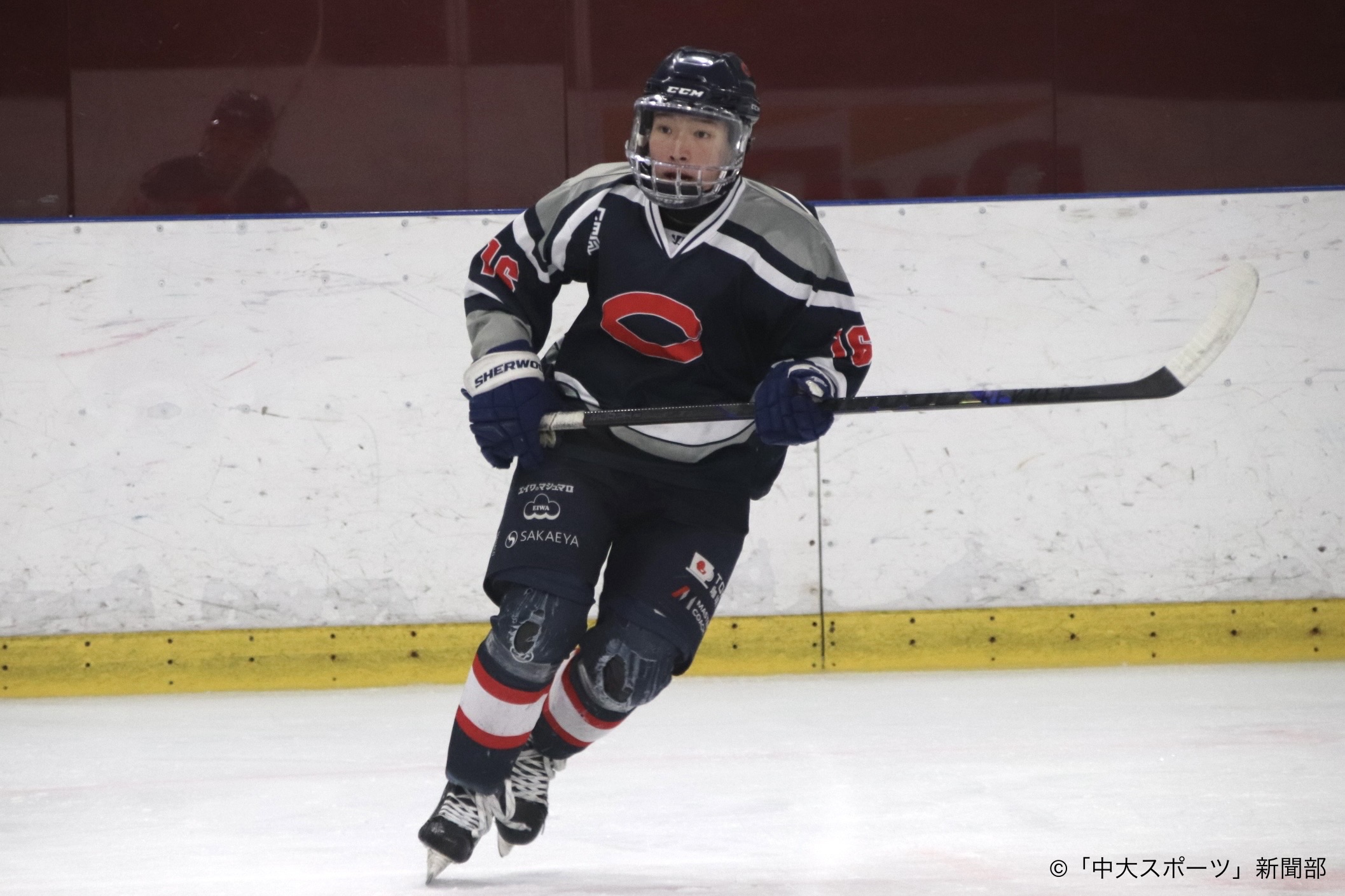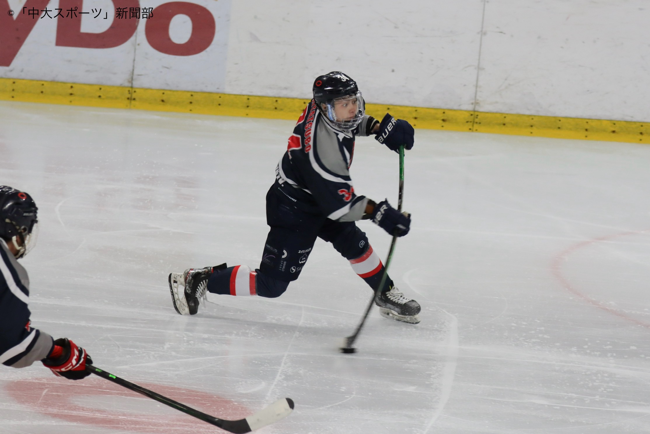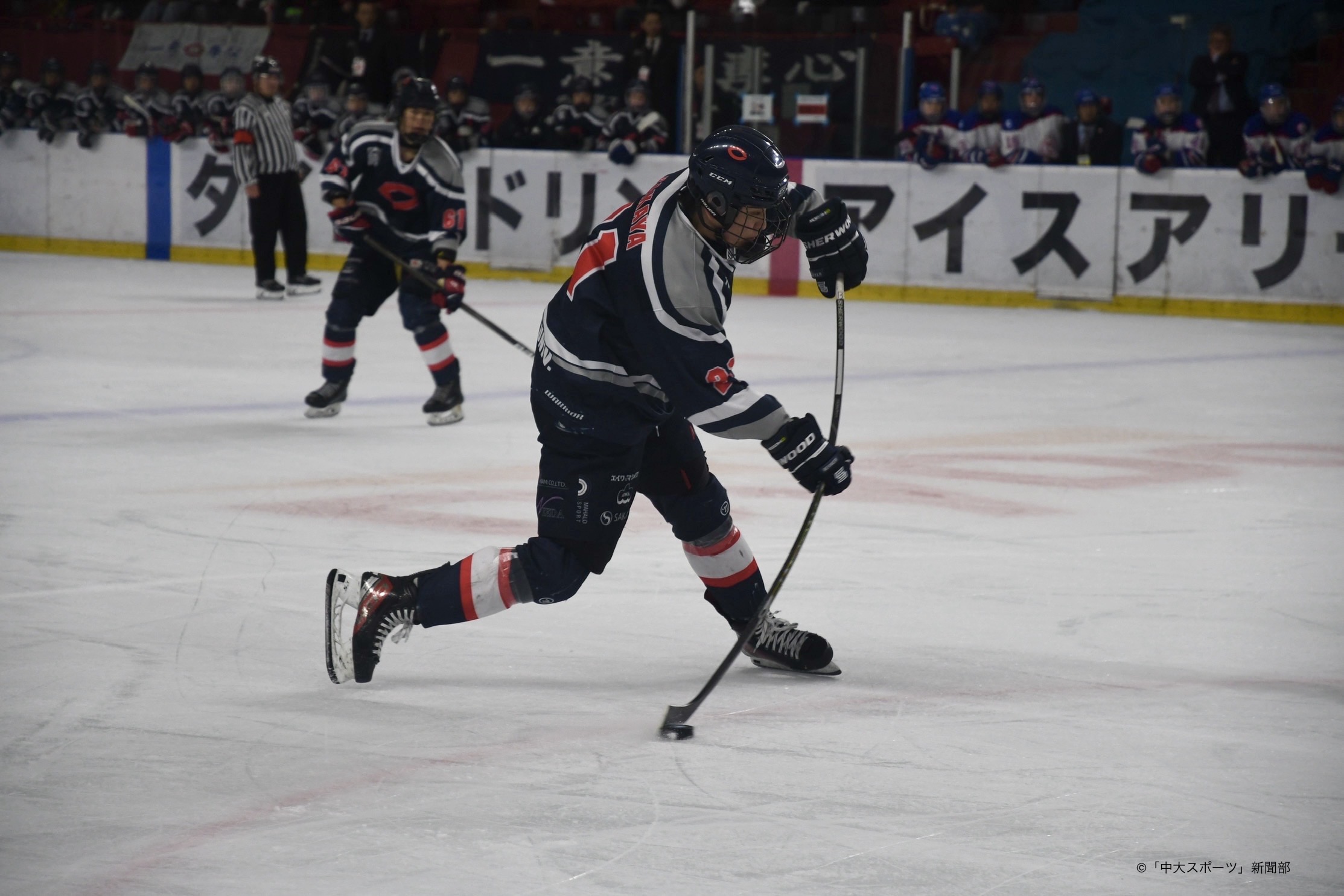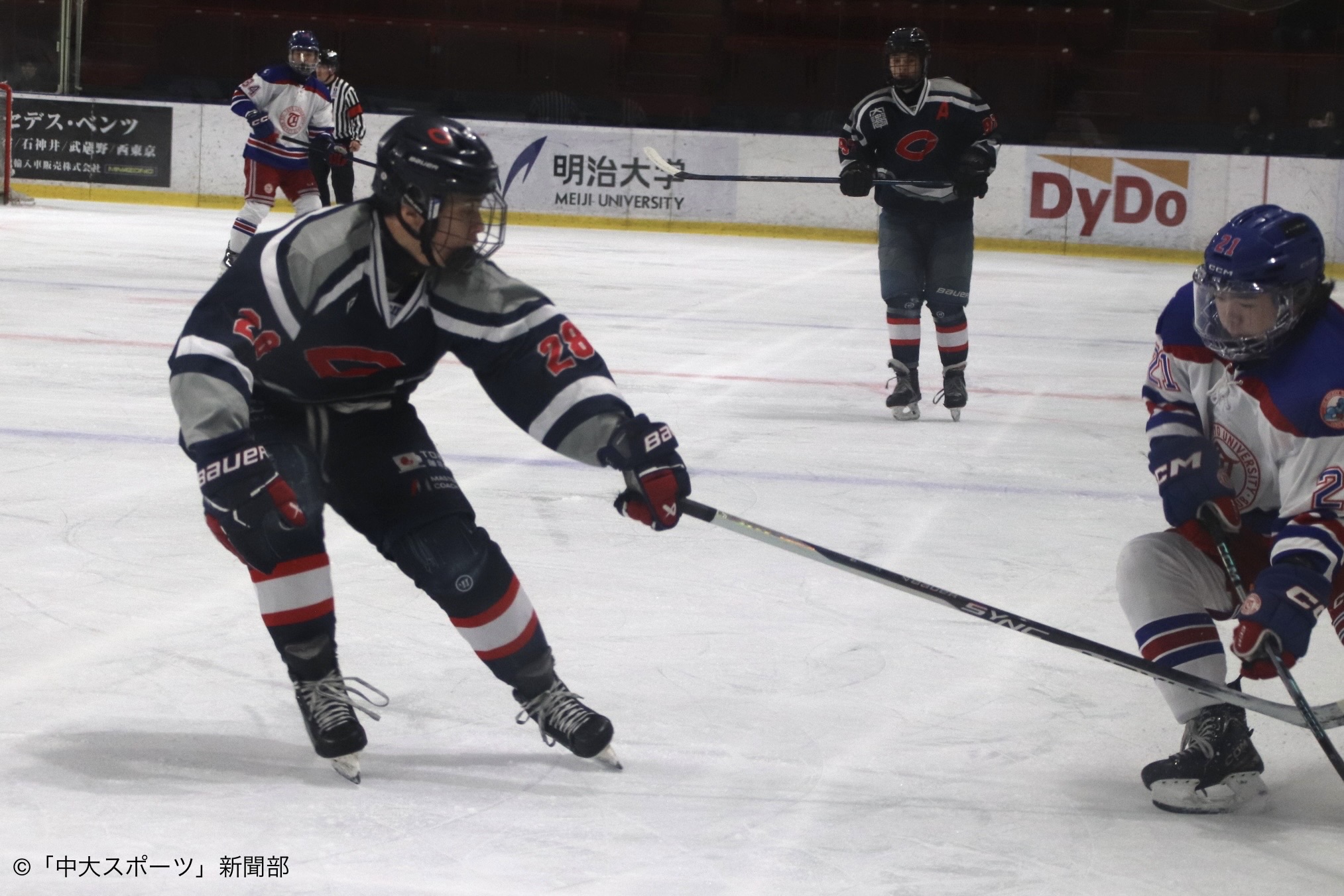 開始早々にDFの隙を突き東洋大が先制点を入れた。パックの奪い合いが激しく行われる中、開始4分、関椋太(商1)が東洋大からパックを奪い、ゴール前にポジションしていた角丸へ。角丸の鋭いシュートが光り、同点へ追いついた。試合はさらに白熱していく。東洋大が攻撃を試みるも森星輝(文3)が華麗にカット。また、GK川合温大(文4)の好セーブにより得点を許さなかった。しかし、東洋大の守備陣も同様に中大の得点を阻止し、1-1で終えた。