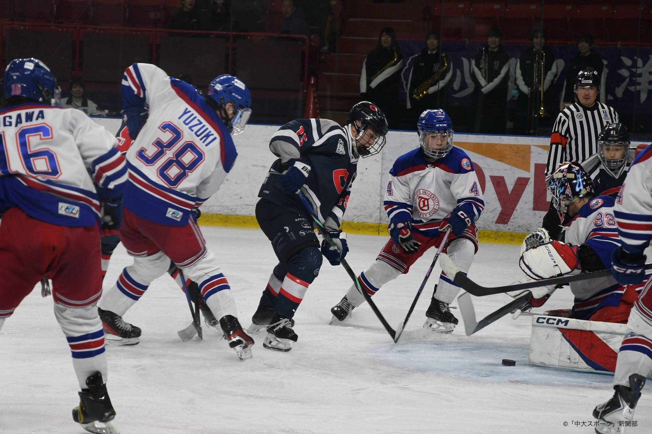 準々決勝の相手は強豪東洋大。大一番の勝負だ。先制点を許すも、エース角丸陸斗(国経4)、横須賀大夢(総4)の得点によりリードする展開となった。しかし、第3ピリオド終盤で追いつかれてしまう。延長戦までもつれ込むが、中谷采士朗(総1)がシュートを決め、勝利を飾った。