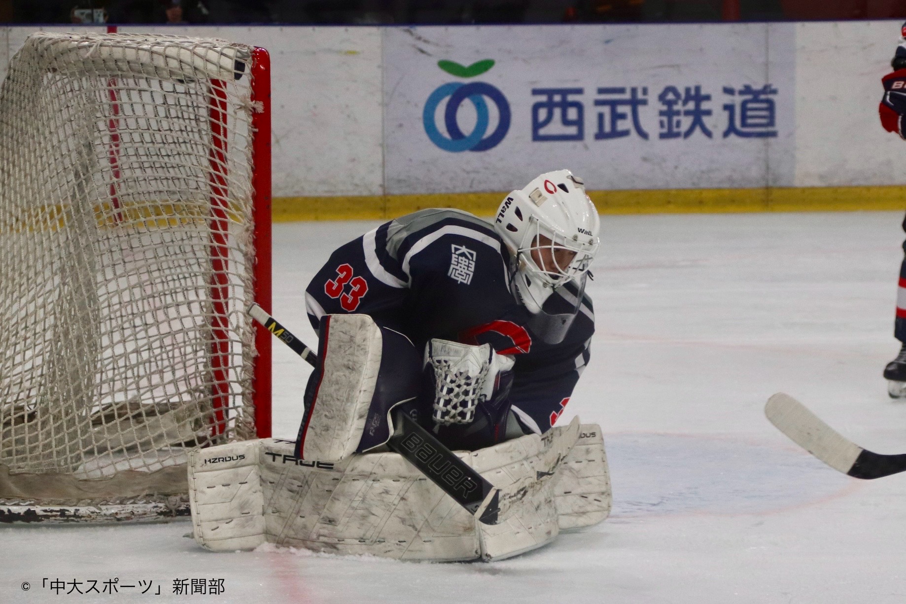 東洋大の反撃には川合が立ちふさがる。絶好調の川合は幾度となくセーブし追随を許さない。中大は1点のリードを奪って、第2ピリオドを終えた。