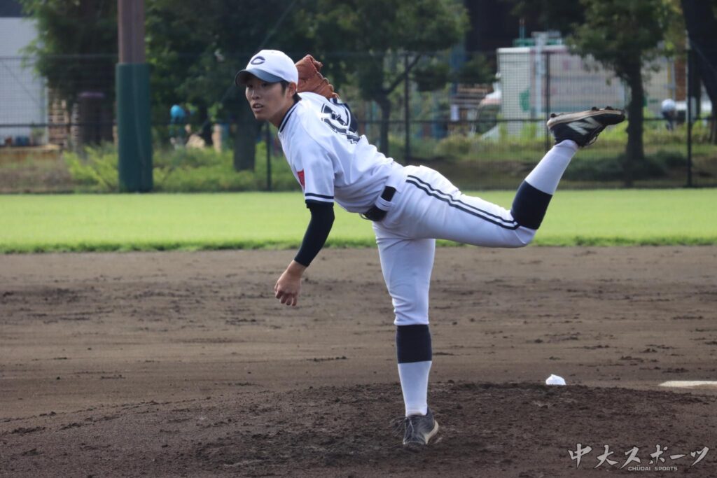 中大の先発は2年生左腕、田邉優河(商2)が務めた。今秋リーグから先発の機会を増やしている田邉は3回に2点を失い先制を許すもそれ以外のイニングを0で抑えていく。