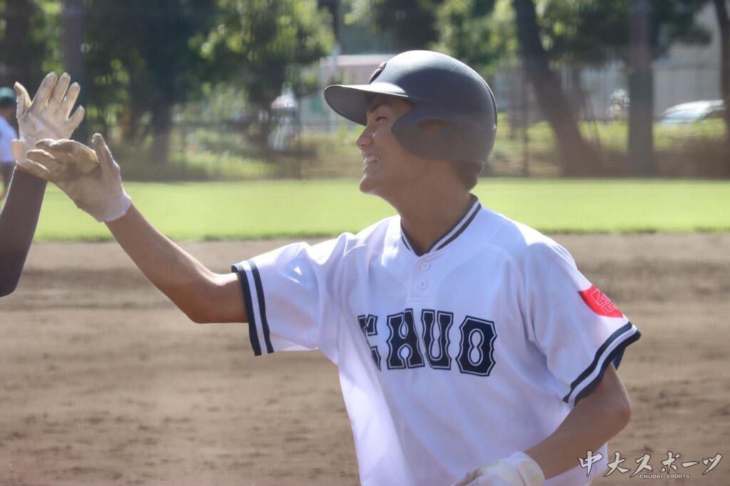 8回裏、またも1年生が躍動した。井上湊(商1)、池島悠空(文1)の1年生コンビが連打で出塁。続く海老沼樹喜主将(経3)がきっちり犠打を決め1死二、三塁のチャンスを作り打席には先ほどホームランの大野が入る。「気持ちで持っていった」と語った一本は勝ち越しの2点タイムリーとなる。