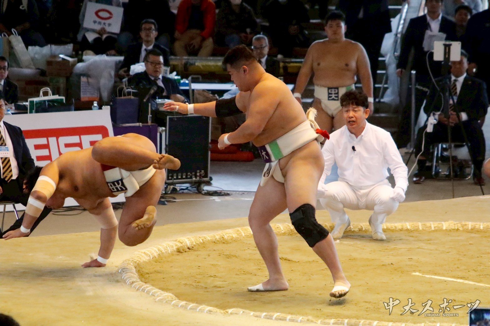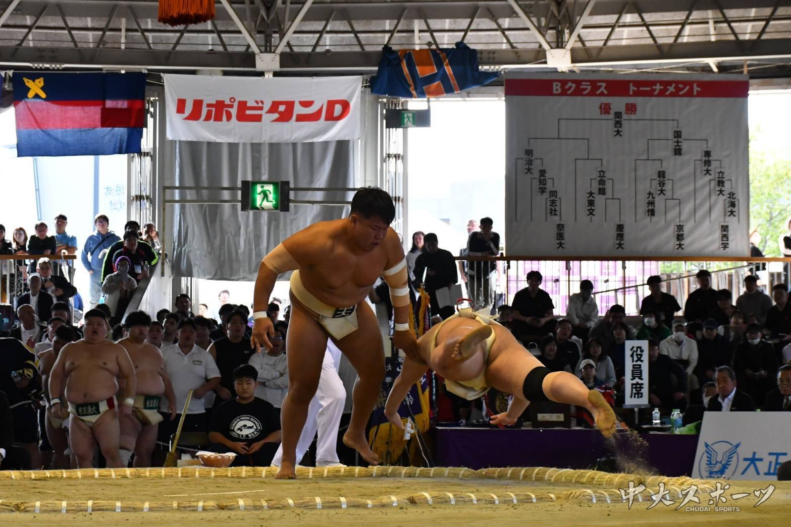 しかし、最終的な勝ち数が順位に影響する団体戦ではチーム勝敗確定後の大将戦も重要な一戦となる。中大の大将は2年生の兼田。兼田は土俵際の攻防を制し上手投げ出しを決め見事に勝利、大将の名に負けぬ相撲を見せた。最終的な勝敗を4勝1敗とした中大が1回戦を勝利した。