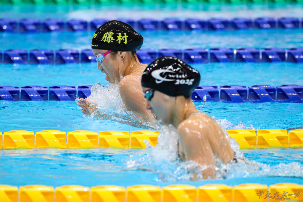 優勝まであと0秒6ほどの差だった。決勝では、序盤から隣を泳ぐ加藤心冨(スウィン鴻巣)との接戦に。予選3位通過の楠田は100mまでに一時はトップに立ったが、最後のターンで再び加藤に並ばれ、残り25mでわずかにかわされた。前回大会でも同種目で加藤に競り負け2位。リベンジとはならなかったものの、大会最終種目で中大勢が表彰台に上がった。