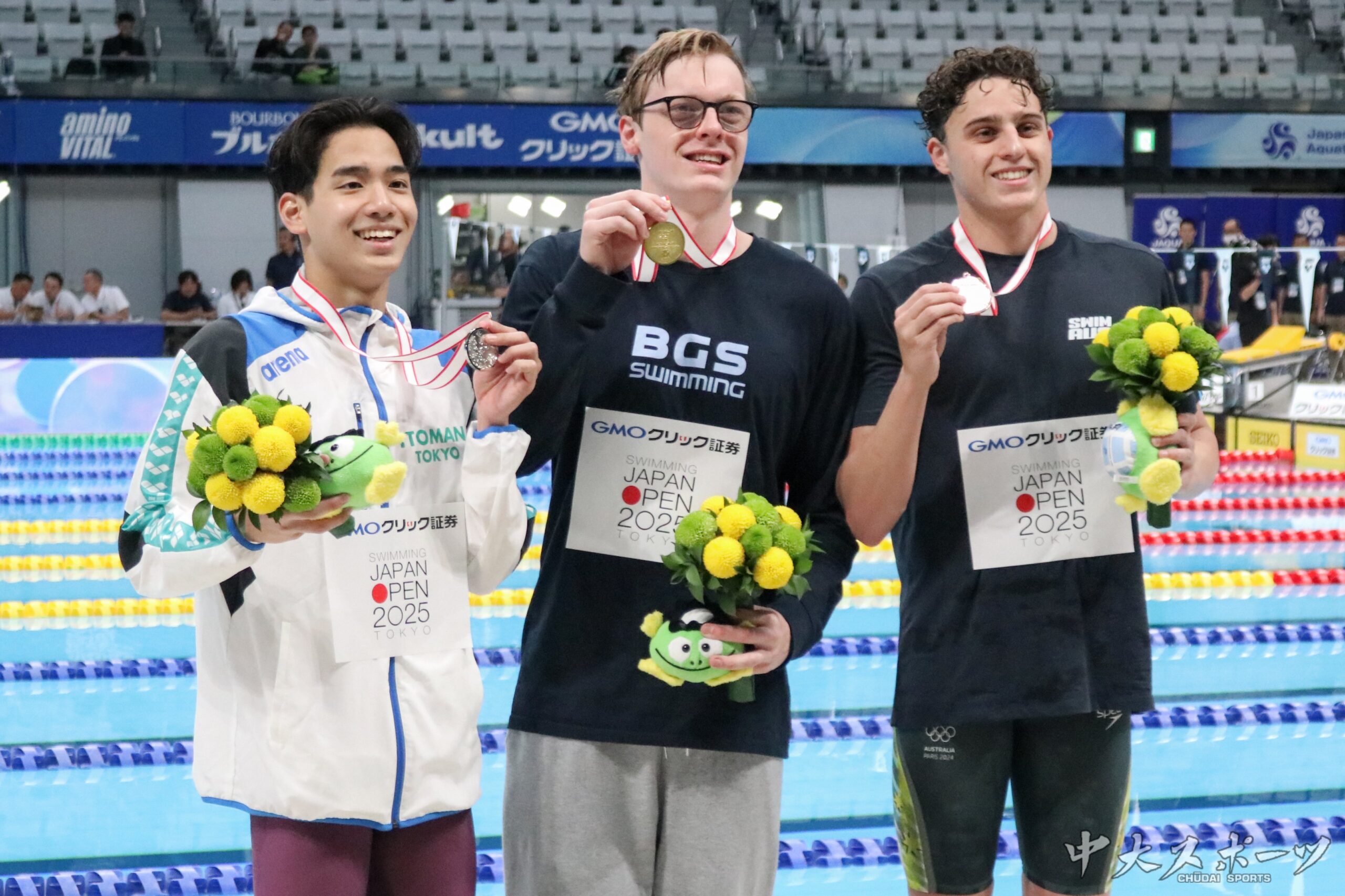 国内の中学生から社会人、さらにオーストラリアのほかカナダや韓国などの海外選手も多数出場しているジャパンオープン。200m自由形決勝は、8人中5人がオーストラリア選手というレースとなった。日本記録(1分44秒54)を持つ村佐は、中盤まで4番手付近で様子をうかがった後、150mのターンで3番手に浮上。ラストスパートをかけ、カイ・テイラーとの競り合いを0秒17差で制した。タイムは1分46秒08。予選は自身と同じイトマン東京所属の柳本幸之介(日大)と同タイムで5位通過だった。