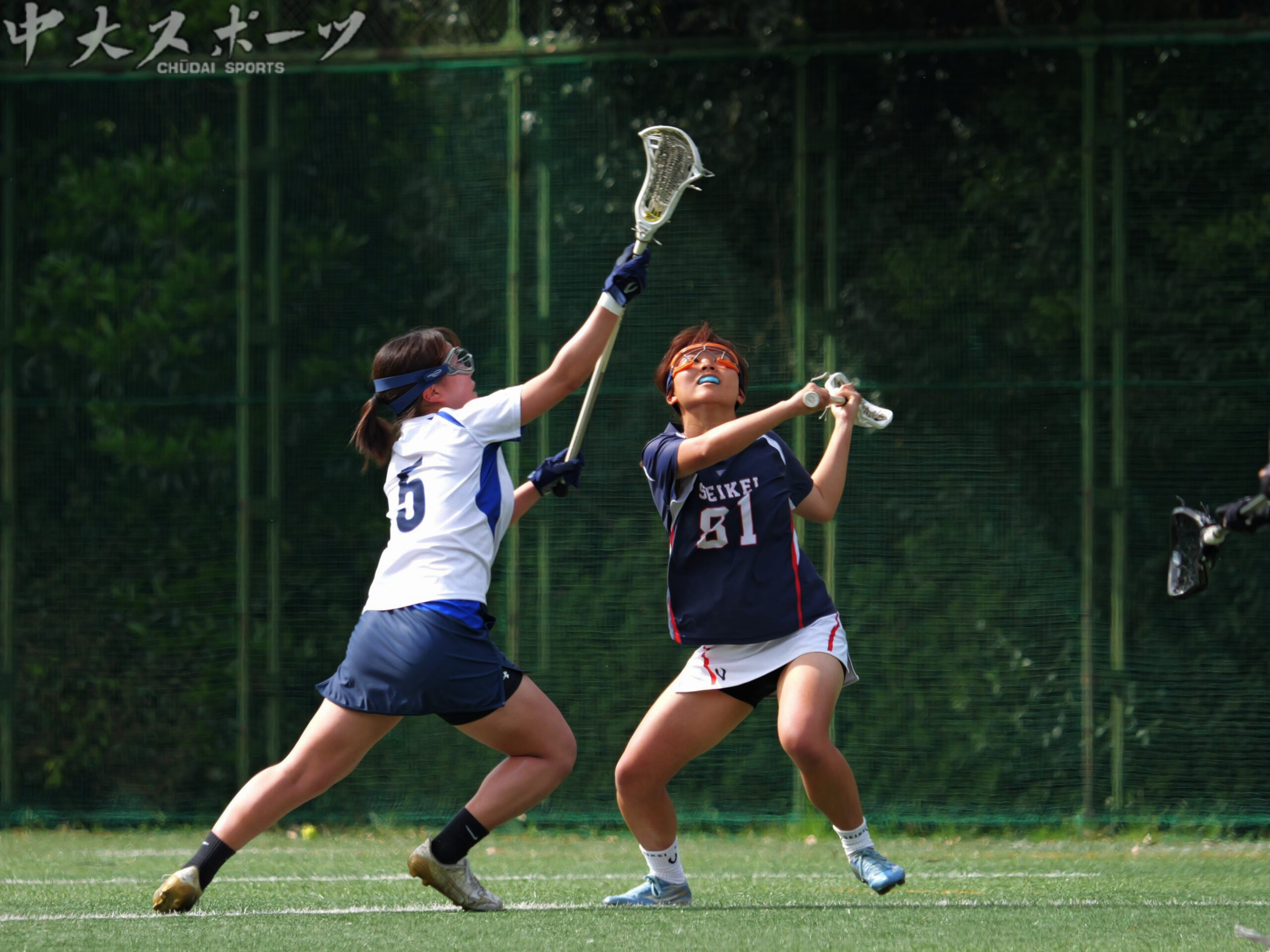 続く第2Q、開始直後は成蹊大のポゼッションが長く続く。中大のパスのミスでこぼれたボールを拾われ、2点を失う。グラウンドボールの取り合いの末に攻撃権を奪われ、しばらく守りの展開が続いた。すると目黒朋香(商4)が相手の攻めを防ぐなど、ディフェンス陣がピンチをしのいで形勢逆転。タイムアウトを経て秋田、金子、小暮とパスがつながりここでフリーシュートを獲得。相手ゴーリーがゴール前にいないポジションからのフリーシュートとなり、このチャンスを逃さず小暮が確実に得点を決める。2―3と1点差まで詰め、前半が終了。